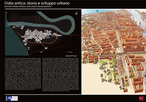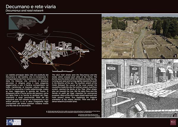 The city’s main streets were the Decumanus and the Cardo, which crossed each other at the Forum. The former was the stretch of the Via Ostiensis inside the city, running east-west and turning slightly towards the south in the direction of the sea. The southern stretch of the Cardo followed...