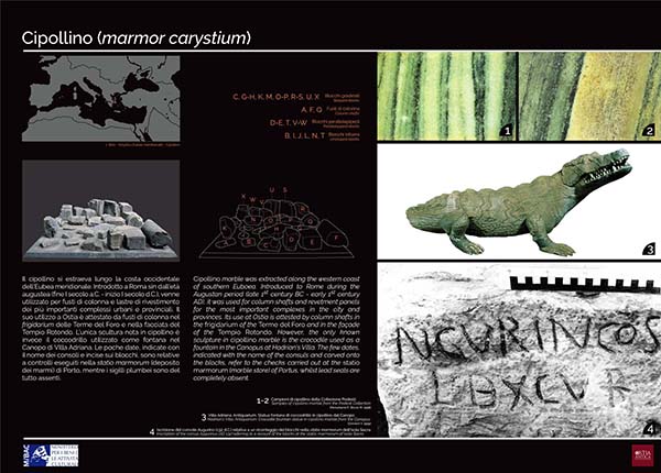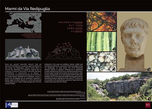 Collected in this area are artefacts, blocks, shafts and architectural elements, recovered in the early 1990s along Via Redipuglia, on Isola Sacra. The most frequently attested marble is cipollino, followed by a substantial number of fragments of africano, architectural elements...