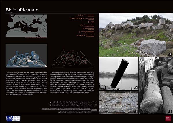This variegated type of africano marble was probably already exhausted by the Flavian period (late 1st century AD), by which time the quarries were only producing a greyish variety rarely traversed by red veins, as attested by the numerous blocks still present at the extraction site of...
