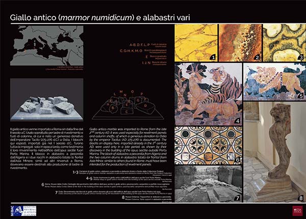 Giallo antico marble was imported to Rome from the late 2nd century AD. It was used especially for revetment panels and column shafts, of which a generous donation to Ostia by the emperor Tacitus (AD 275-276) is documented. The blocks on display here, imported already in the 1st century AD,...