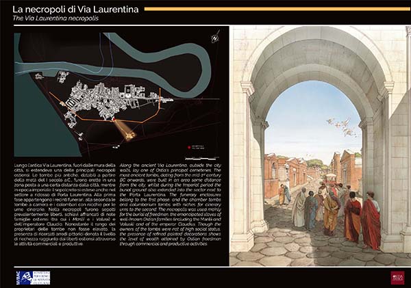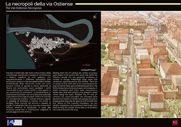 Starting from the 2nd century BC, tombs of various types began to be built on the south side of the Via Ostiensis outside the city, gradually increasing in number to occupy increasingly large areas and sometimes superimposed on one another. There are no tombs on the north side of the road...