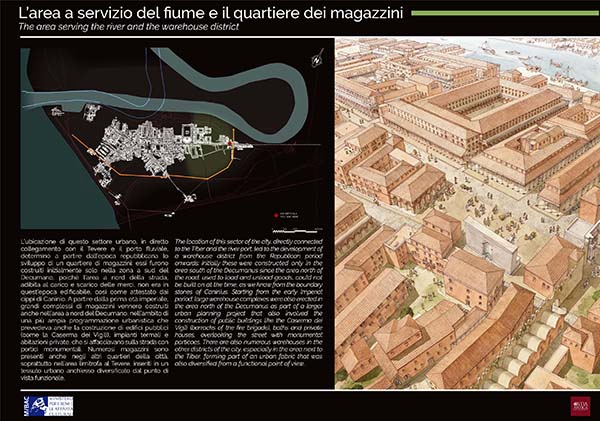 The location of this sector of the city, directly connected to the Tiber and the river port, led to the development of a warehouse district from the Republican period onwards: initially these were constructed only in the area south of the Decumanus since the area north of the road, used to...