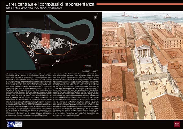 At the centre of this district lies the Forum square: located where the Cardo and the Decumanus cross, it played a central role in the civic and religious life of the city from the foundation of the castrum (4th century BC). It was only at the start of the Imperial period that this...