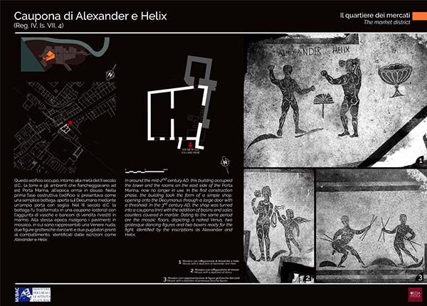 In around the mid-2nd century AD, this building occupied the tower and the rooms on the east side of the Porta Marina, now no longer in use. In the first construction phase, the building took the form of a simple shop, opening onto the Decumanus through a large door with a threshold....