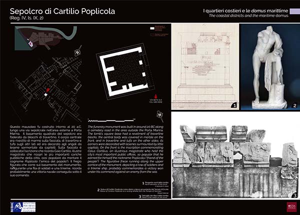 The funerary monument was built in around 20 BC along a cemetery road in the area outside the Porta Marina. The tomb’s square base had a revetment of travertine blocks; the central body was covered in marble on the front, and in travertine and tufa on the other sides; its corners...