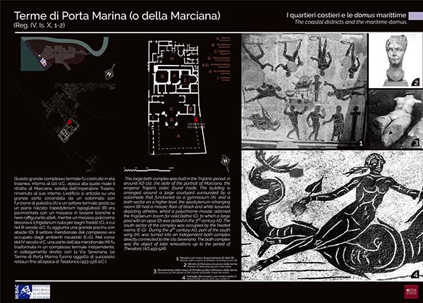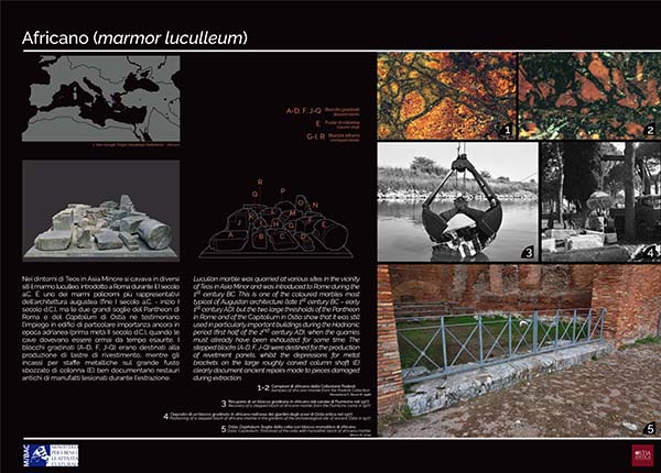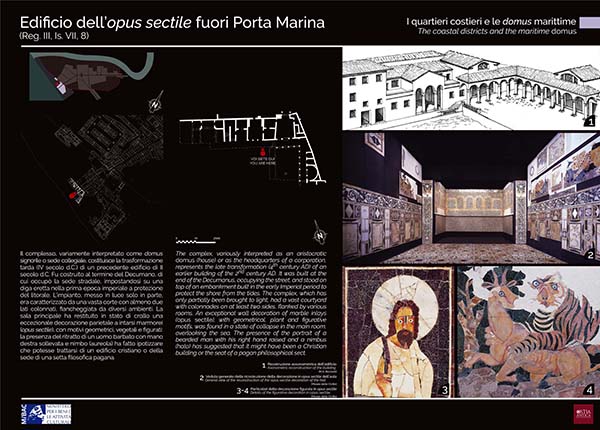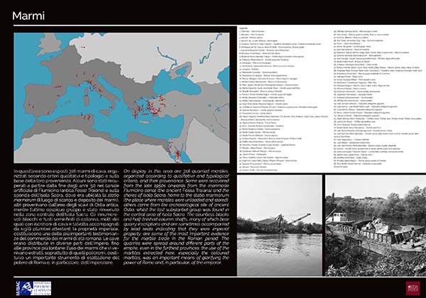 On display in this area are 318 quarried marbles, organized according to qualitative and typological criteria, and their provenance. Some were recovered from the late 1950s onwards from the manmade Fiumicino canal (the ancient Fossa Traiana) and the shores of Isola Sacra, home to the...