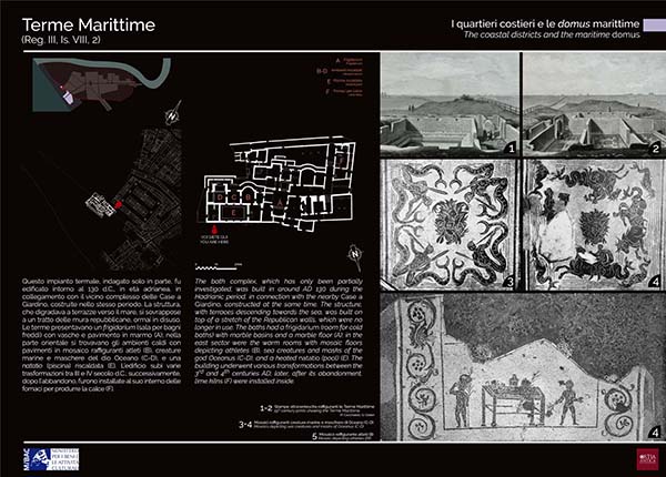 The bath complex, which has only been partially investigated, was built in around AD 130 during the Hadrianic period, in connection with the nearby Case a Giardino, constructed at the same time. The structure, with terraces descending towards the sea, was built on top of a stretch of...
