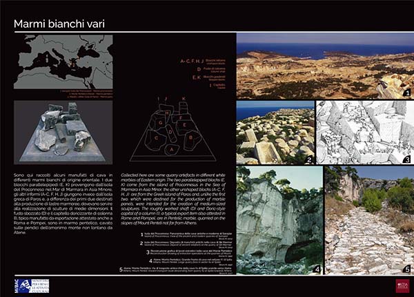 Collected here are some quarry artefacts in different white marbles of Eastern origin. The two parallelepiped blocks (E, K) come from the island of Proconnesus in the Sea of Marmara in Asia Minor; the other unshaped blocks (A-C, F, H, J) are from the Greek island of Paros and, unlike the...