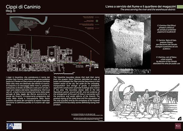I cippi in travertino, che prendevano il nome dal pretore Caio Caninio, delimitavano un’area pubblica posta tra il Tevere e il Decumano nel settore orientale della città; essa era destinata alle attività di scarico, di trasporto e di stoccaggio delle merci e, pertanto, sottoposta al...