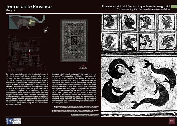 Saggi di scavo al di sotto della strada, risalente agli inizi del II secolo d.C., hanno portato alla luce un impianto termale dell’età di Claudio (41-54 d.C.), di cui non è possibile precisare l’estensione. L’unico elemento tuttora visibile è un pregevole mosaico in bianco e nero in...