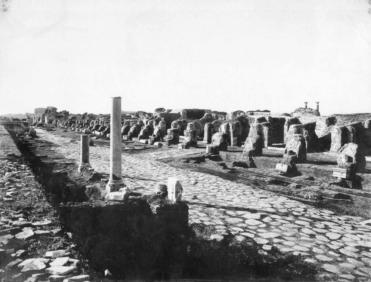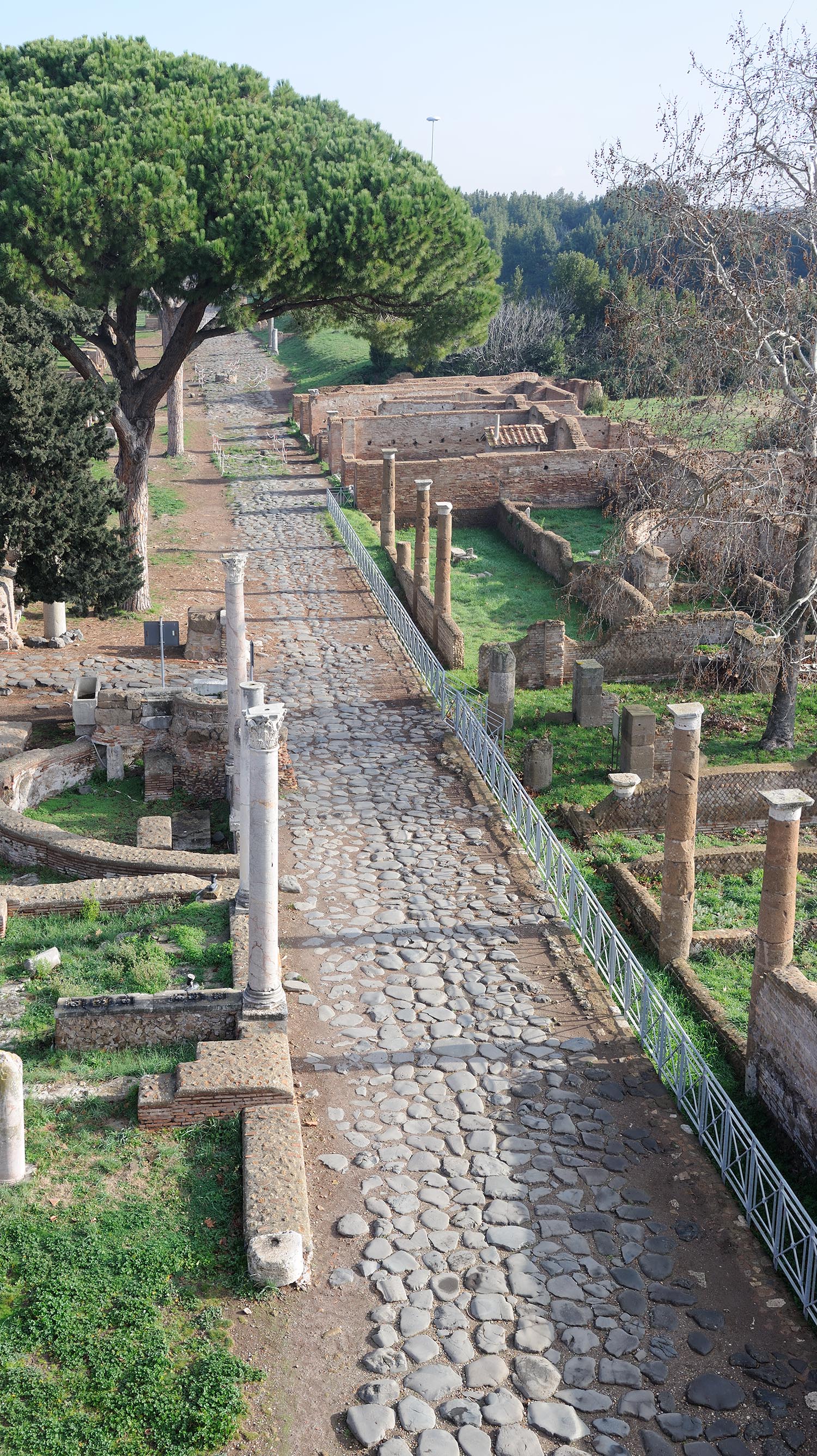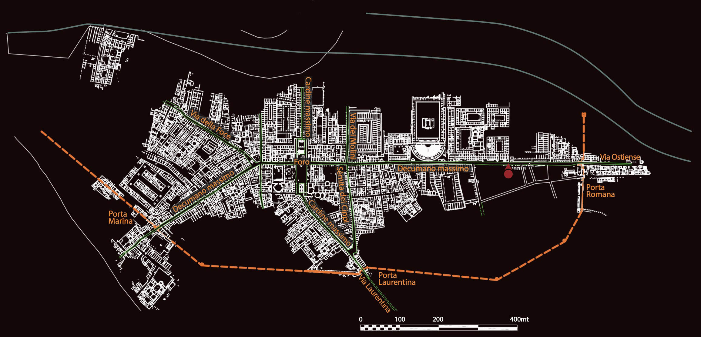 The city’s main streets were the Decumanus and the Cardo, which crossed each other at the Forum. The former was the stretch of the Via Ostiensis inside the city, running east-west and turning slightly towards the south in the direction of the sea. The southern stretch of the Cardo followed the course of the more ancient Via Laurentina inside the city; the northern stretch, built from scratch, reached the banks of the Tiber. Other streets also ran towards the river, like Via della Foce and the Semita (or path) dei Cippi, important for commercial purposes. Many of the city’s major streets were built over more ancient routes, thus explaining the irregular orientation of the various districts. There was also a dense network of smaller lanes.