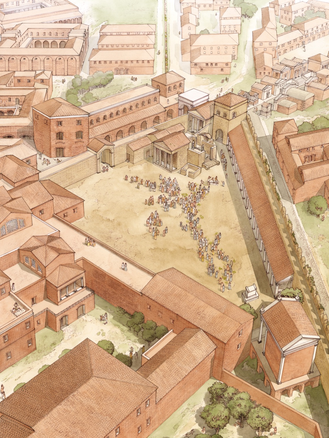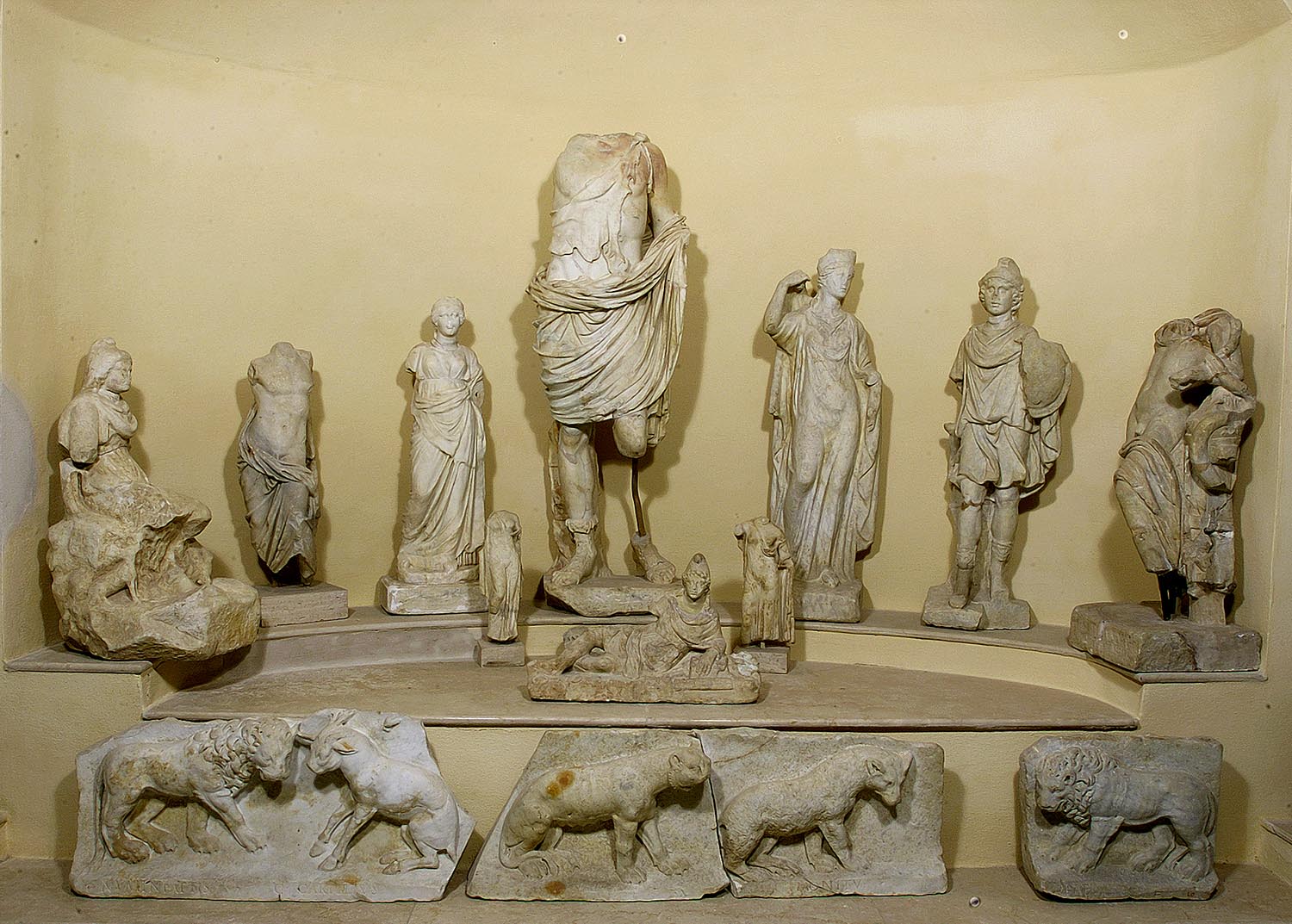 The district south of the Forum took on a prevalently private character already in the Republican period. A significant number of luxurious domus (residences) were built along the southern stretch of the Cardo Maximus, in addition to baths and buildings with an artisanal and commercial function. In an outlying area of the city, near the Porta Laurentina, a sanctuary was built to Cybele or Magna Mater, the fertility goddess of eastern origin who was particularly popular in Ostia during the Imperial period. The sacred area, of triangular shape, was the city’s largest; within, temples and shrines dedicated to the cult of Cybele and the gods associated with her were erected. The cult buildings were arranged around a large open space in which the religious rituals took place, among which a pre-eminent role was reserved for sacred processions and bull sacrifices (taurobolia).