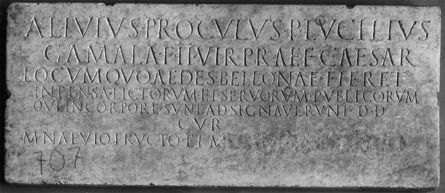 Inscription to A. Livius Proculus and P. Lucilius Gamala commemorating the donation of the land for the construction of the Temple of Bellona