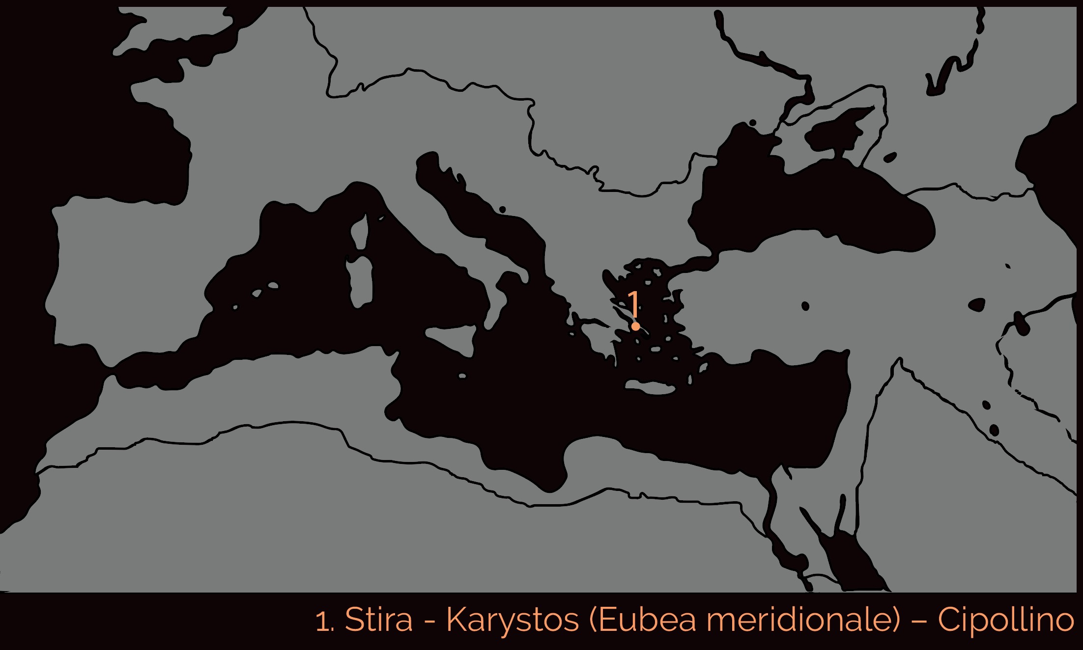 Cipollino marble was extracted along the western coast of southern Euboea. Introduced to Rome during the Augustan period (late 1st century BC - early 1st century AD), it was used for column shafts and revetment panels for the most important complexes in the city and provinces. Its use at Ostia is attested by column shafts in the frigidarium of the Terme del Foro and in the façade of the Tempio Rotondo. However, the only known sculpture in cipollino marble is the crocodile used as a fountain in the Canopus at Hadrian’s Villa. The few dates, indicated with the name of the consuls and carved onto the blocks, refer to the checks carried out at the statio marmorum (marble store) of Portus, whilst lead seals are completely absent.
