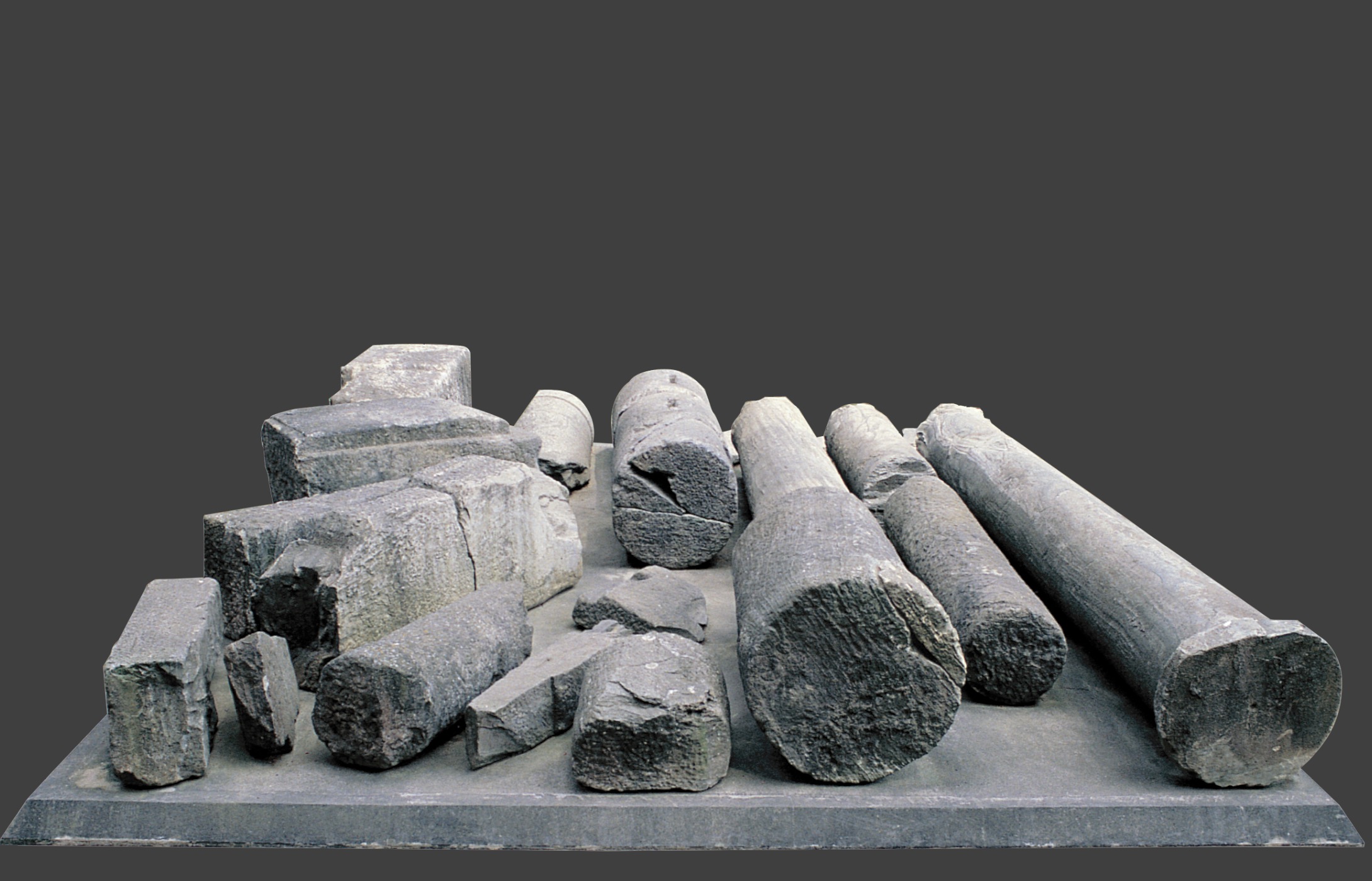 The different stages of making large column shafts are documented in detail at the quarries of Kylindroi near Karystos. The heavy blocks were exported at different stages of finishing, as shown by some of the pieces on display: the almost completely finished intact shaft (H) illustrates the final stages, carried out by specialized stonecutters at the statio marmorum on Isola Sacra. Other cylindrical pieces, without mouldings at the ends and lacking the tapering of the shaft, were destined for the production of marble discs to be used in floor decorations.