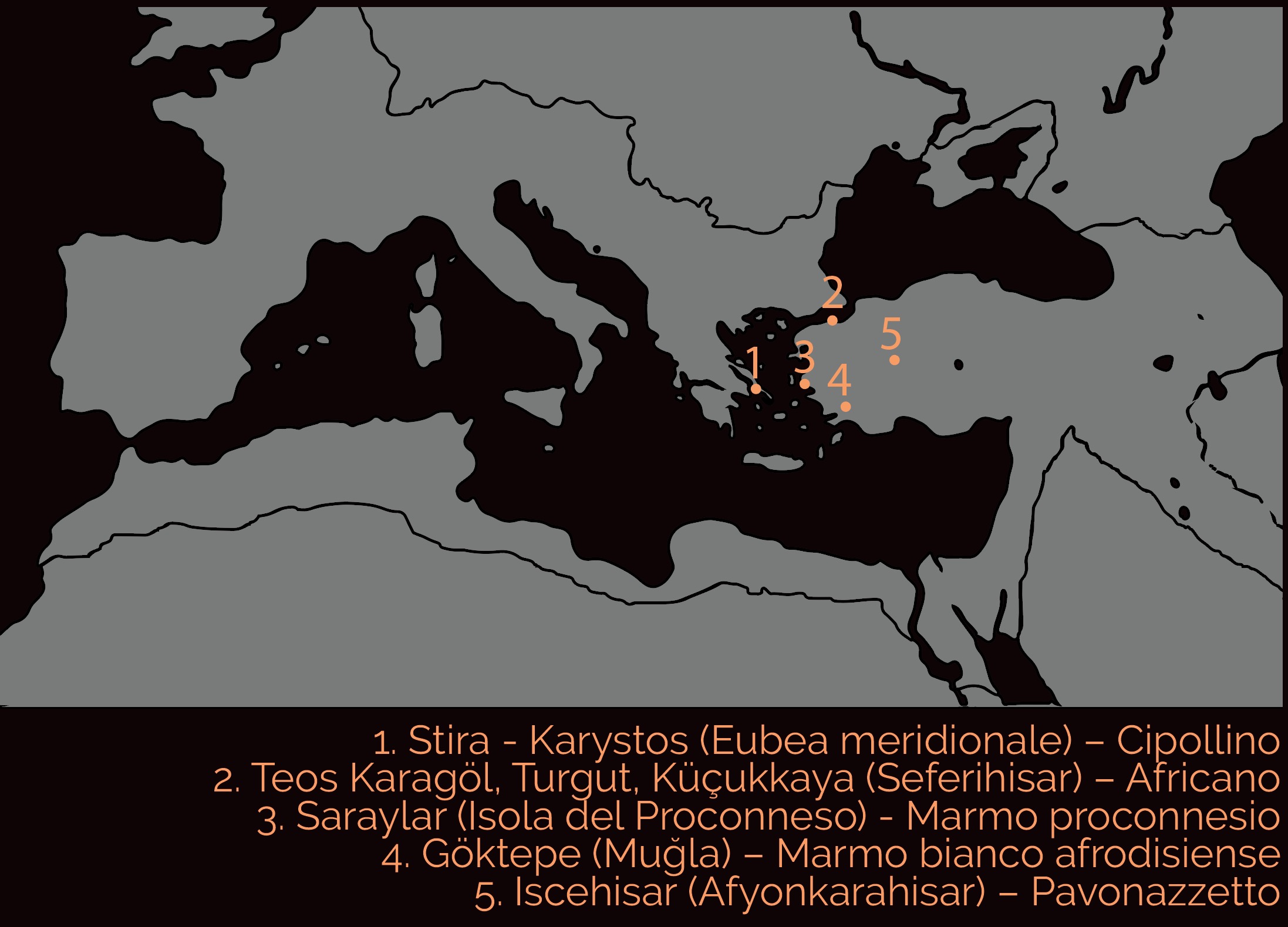 Collected in this area are artefacts, blocks, shafts and architectural elements, recovered in the early 1990s along Via Redipuglia, on Isola Sacra. The most frequently attested marble is cipollino, followed by a substantial number of fragments of africano, architectural elements in Proconnesian marble and a block of pavonazzetto. A fair number of fragments are in Aphrodisian white marble from Göktepe: this is a fine-grained marble that was favoured for Imperial portraiture starting from the early 2nd century AD; an example is the posthumous portrait of Trajan from the marble workshop near the Theatre.