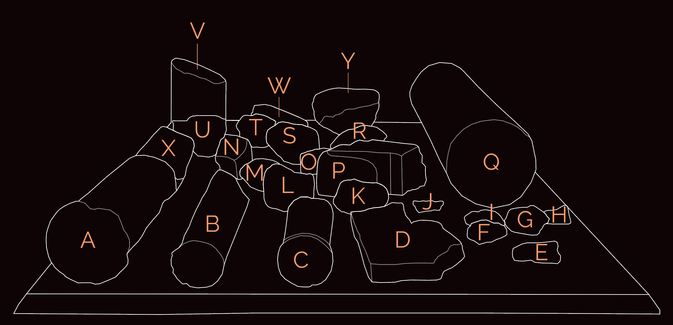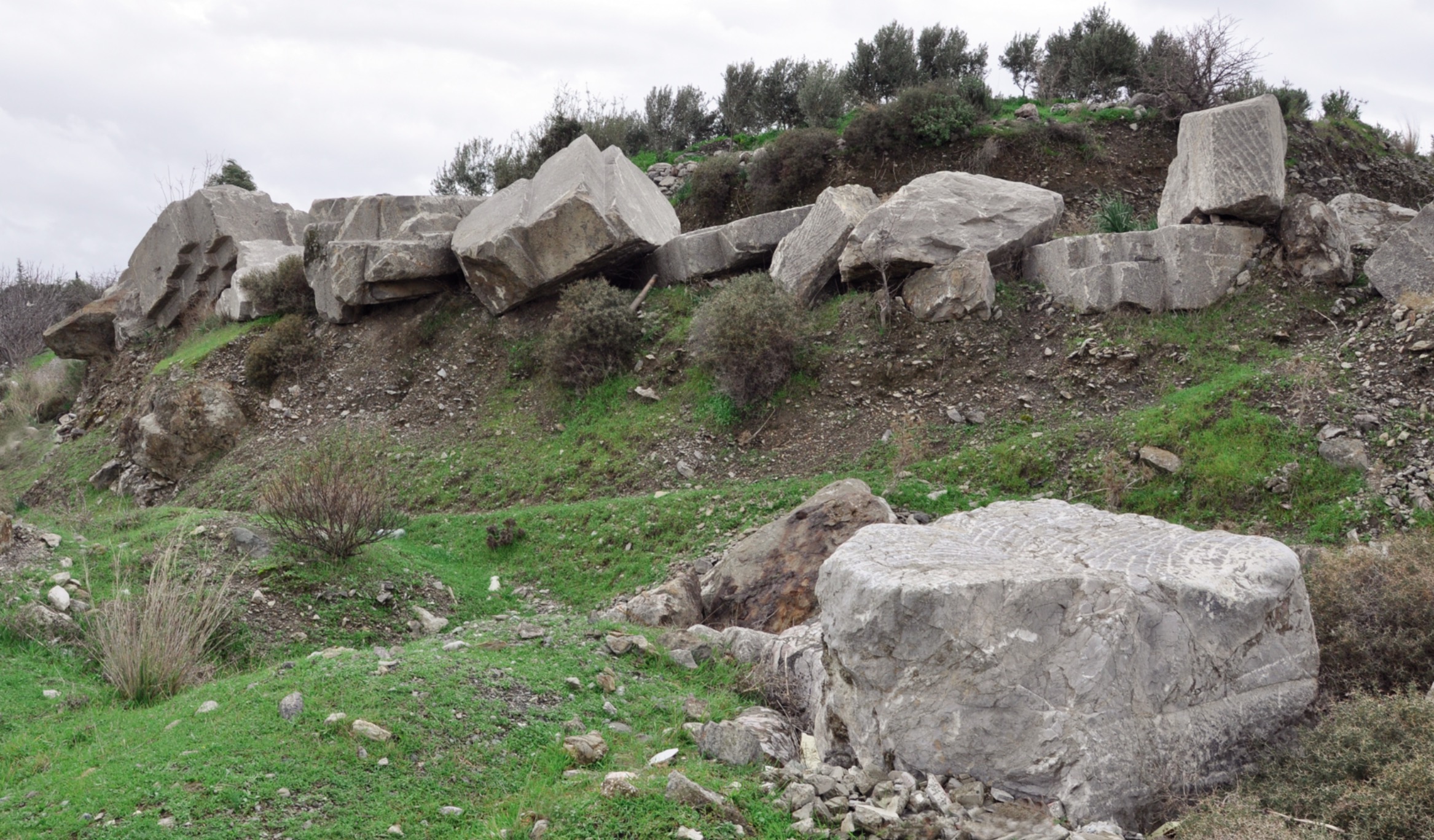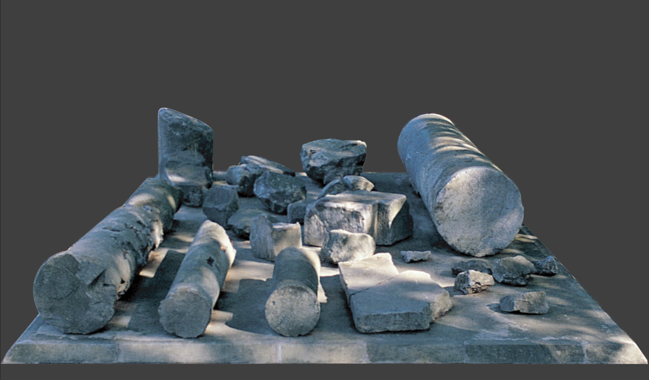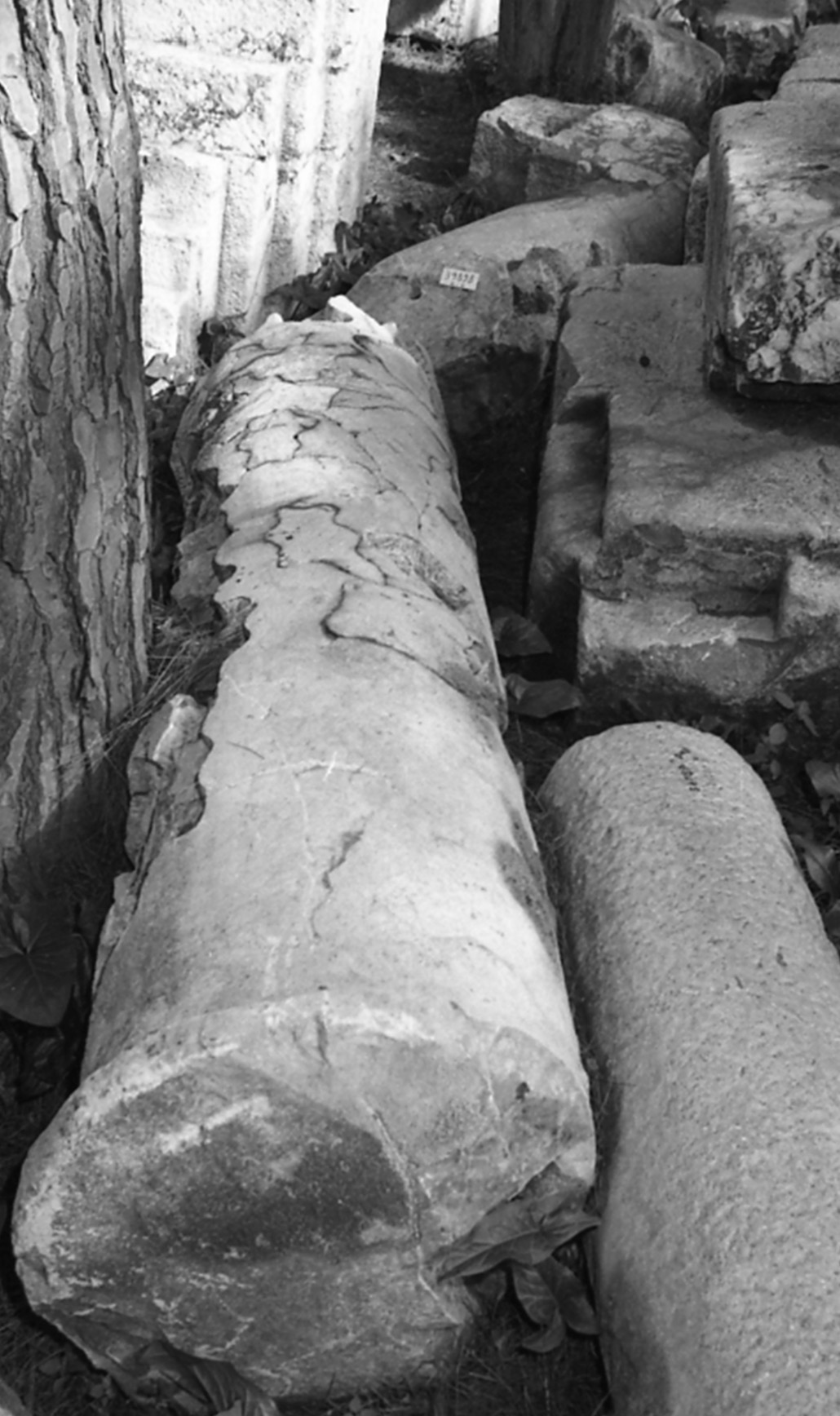 This variegated type of africano marble was probably already exhausted by the Flavian period (late 1st century AD), by which time the quarries were only producing a greyish variety rarely traversed by red veins, as attested by the numerous blocks still present at the extraction site of Karagöl near Teos. The fragments of inlaid column (A-B, X) are unique today and also provide evidence of the complex and laborious attempt to artificially recreate the original polychromy of africano marble, by then difficult to find, by inserting small curved pieces of the rosso brecciata variety into a grey-coloured shaft.