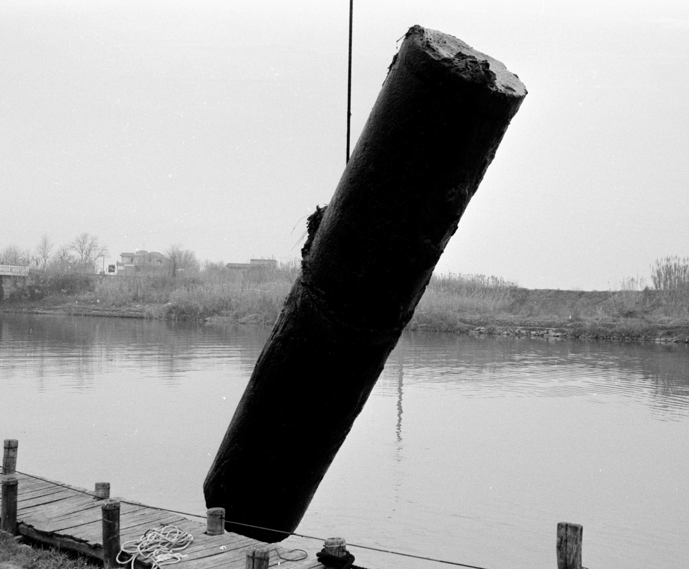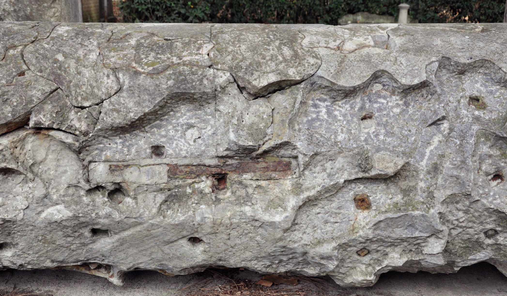 Detail of the inlaid column shaft with a bracket from restoration work, empty depressions with cavities for pins inserts