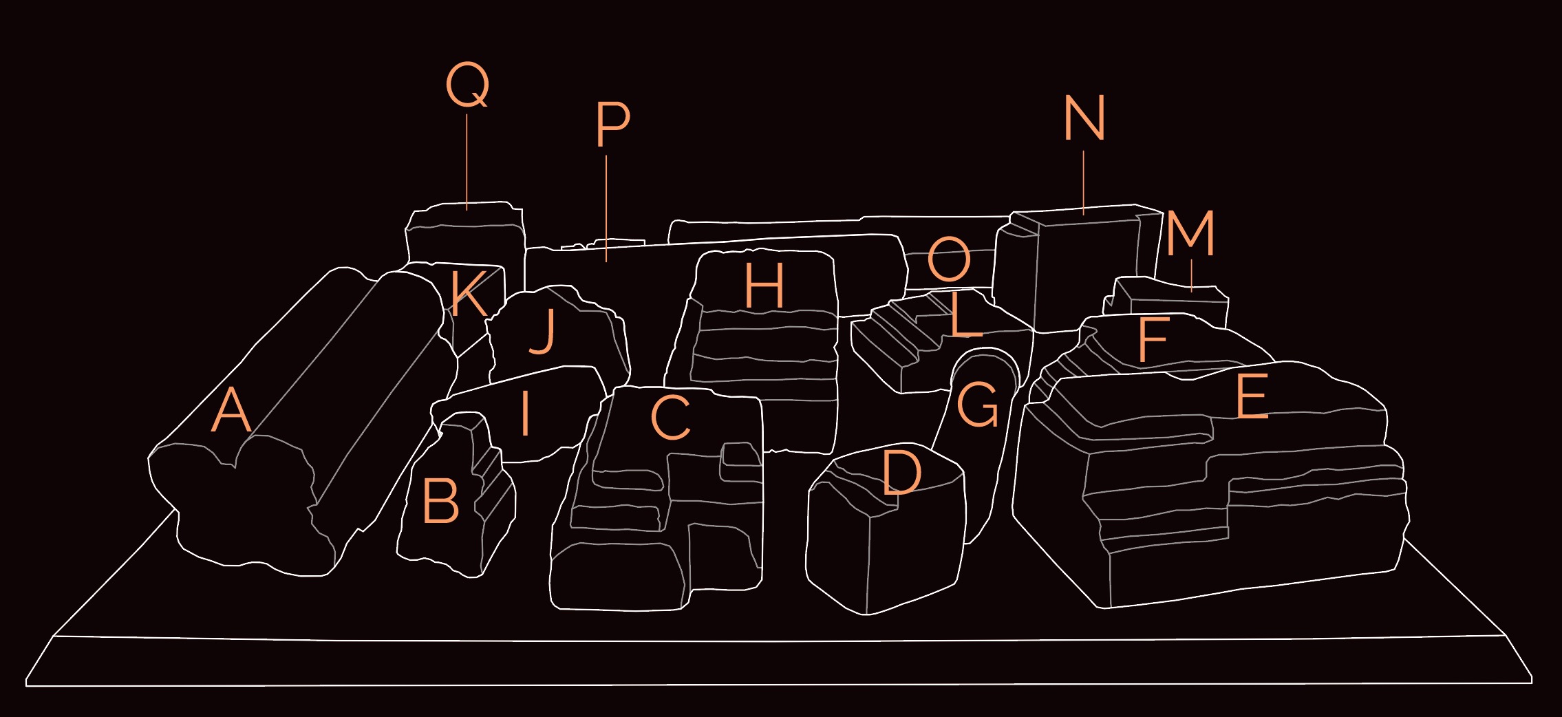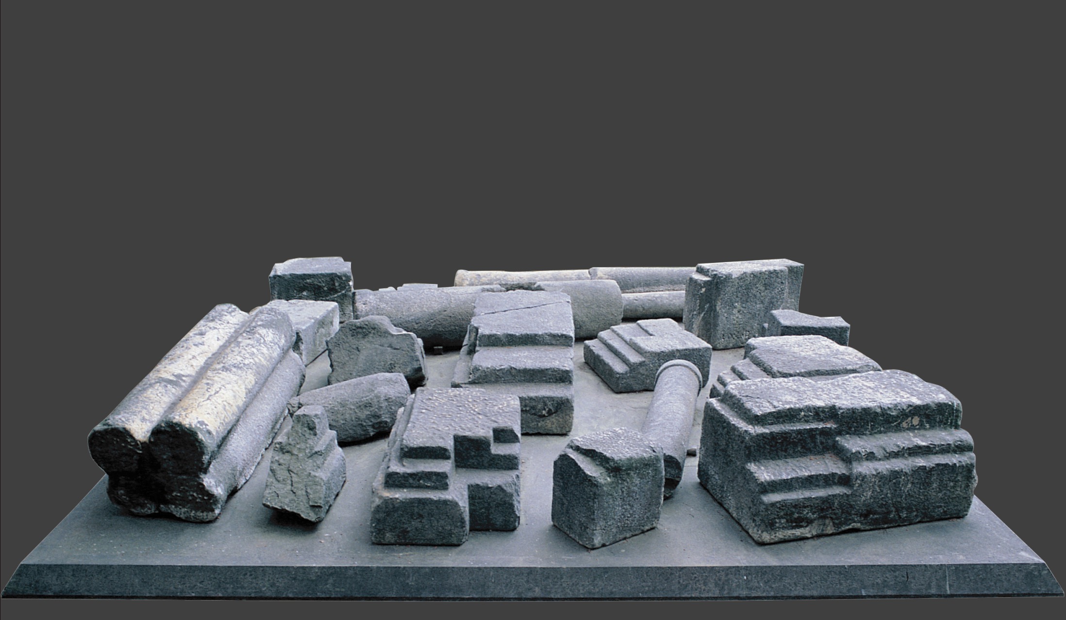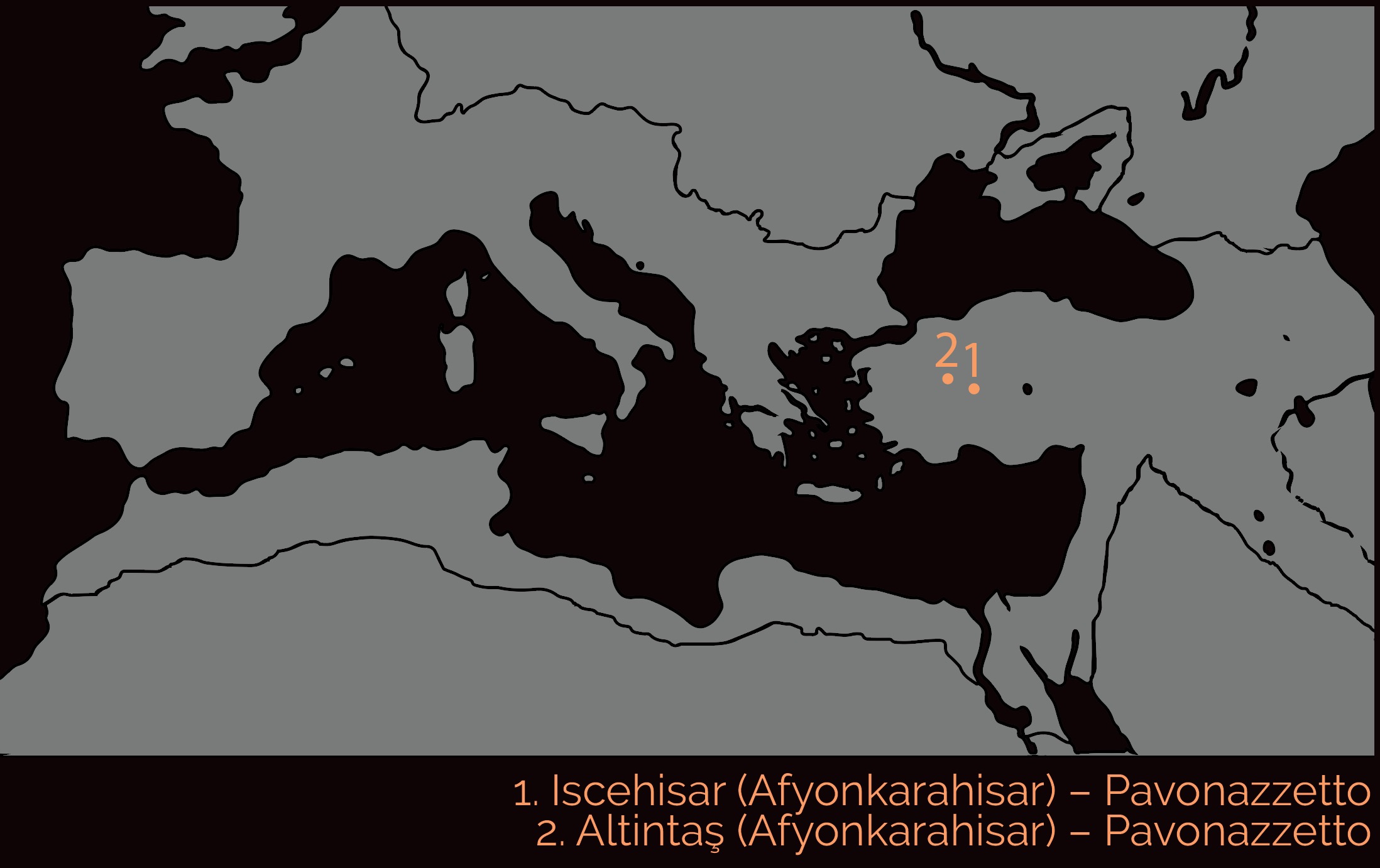Pavonazzetto marble, extracted from the quarries of Phrygia from the mid-Augustan period (late 1st century BC โ early 1st century AD), was counted among the most prized marbles and was prevalently used for sculpture groups: prominent among these were the statues of subjugated Barbarians (also known as Phrygians), to which the use of this marble was well-suited. Revetment panels โ for the production of which the stepped blocks were destined โ adorned important public buildings, whilst column shafts, like those of the Capitolium in Ostia, embellished Imperial architecture. The four- and two-lobed columns (A, O), to be separated once they reached their destination, illustrate means of safe transport.