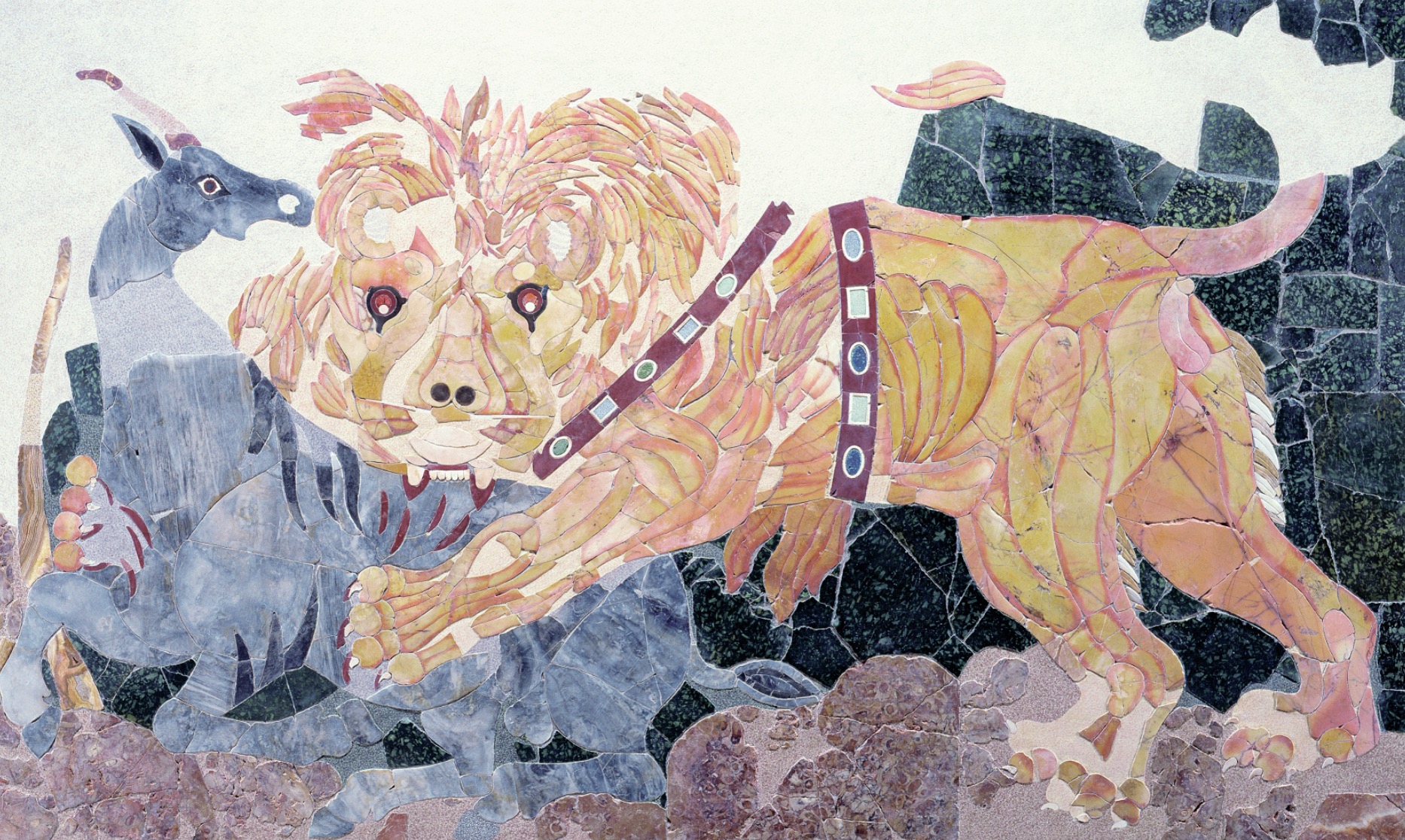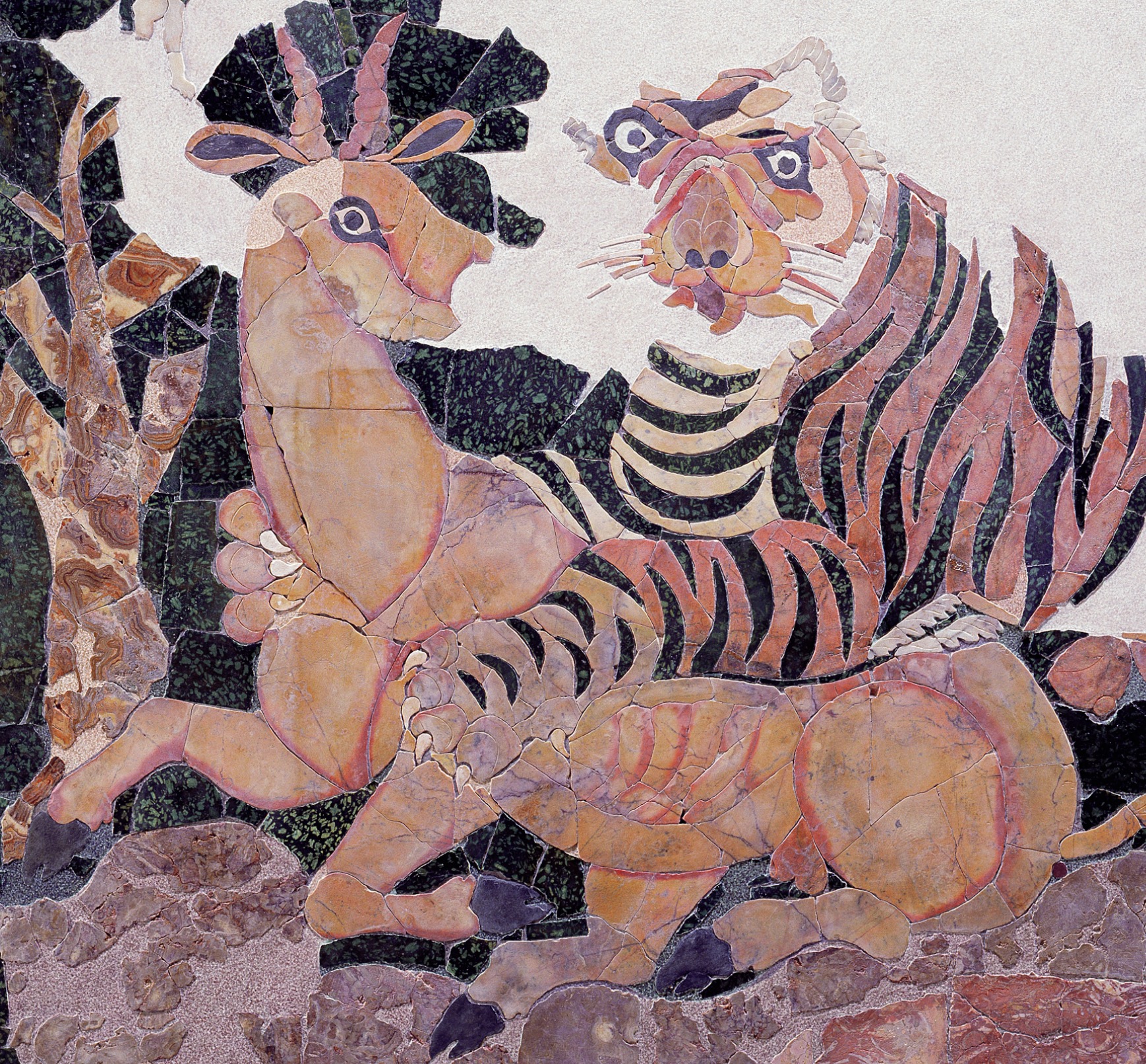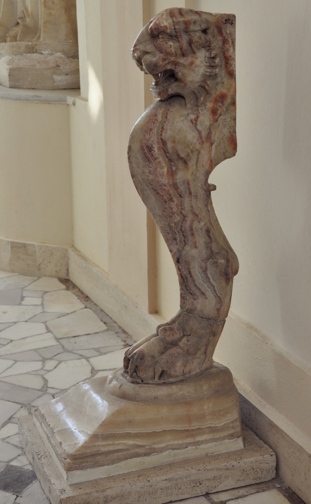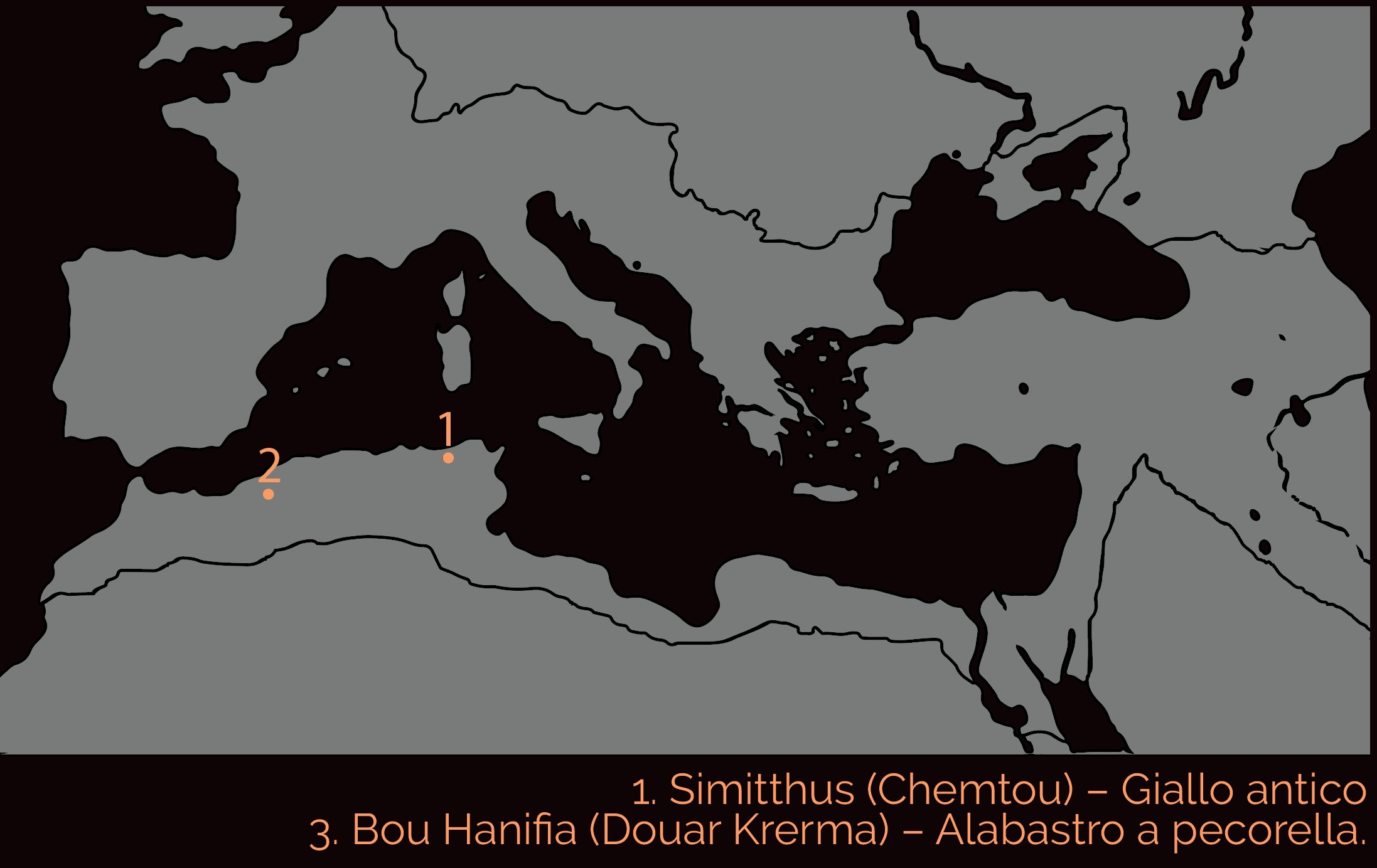 Giallo antico marble was imported to Rome from the late 2nd century AD. It was used especially for revetment panels and column shafts, of which a generous donation to Ostia by the emperor Tacitus (AD 275-276) is documented. The blocks on display here, imported already in the 1st century AD, were used only in a late period, as shown by their discovery in the building of the opus sectile outside Porta Marina. The block of alabastro a pecorella from Algeria and the two column drums in alabastro listato (or fiorito) from Asia Minor, similar to others found in Rome, must have been intended for the production of revetment panels.