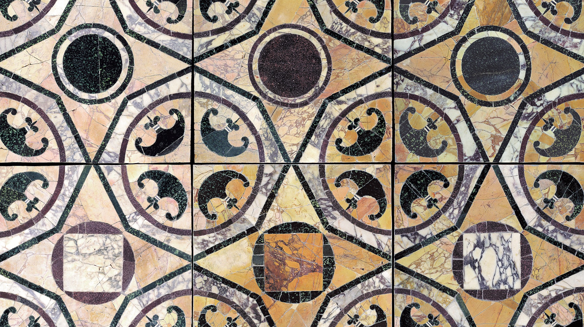 Rome, Museo delle Civiltà. Detail of the floor in the building of the opus sectile in giallo antico, pavonazzetto, serpentino and porfido rosso egiziano