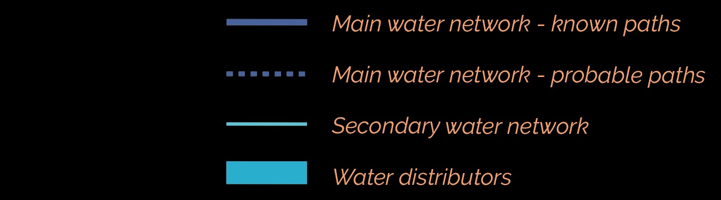 Until the 1st century AD, Ostia’s water supply was guaranteed by rainwater, collected in cisterns, and by wells drawing on the ground water. The city’s aqueduct was built, under Tiberius (AD 14-37) or Caligula (AD 37-41). It ended at the reservoir adjacent to the walls south of the Porta Romana. From here, the water was distributed throughout the city by an extensive network of cisterns and lead pipes (fistulae), inscribed with the name of the colony or of the concessionaries. The water network supplied public and private buildings; however, ground water continued to be used, with water being drawn up using wooden water wheels (noriae). The aqueduct remained in use until the 5th century AD; after its abandonment, water was once again provided by wells, some of which were dug into the middle of the streets, by now also partially in disuse.