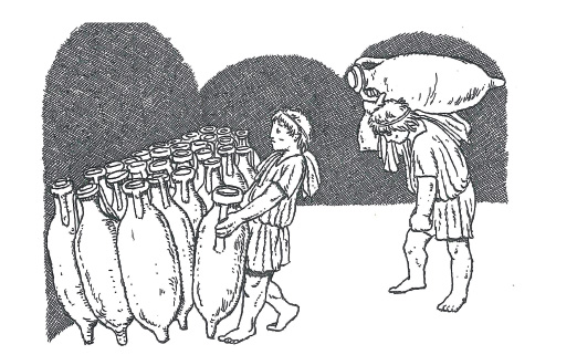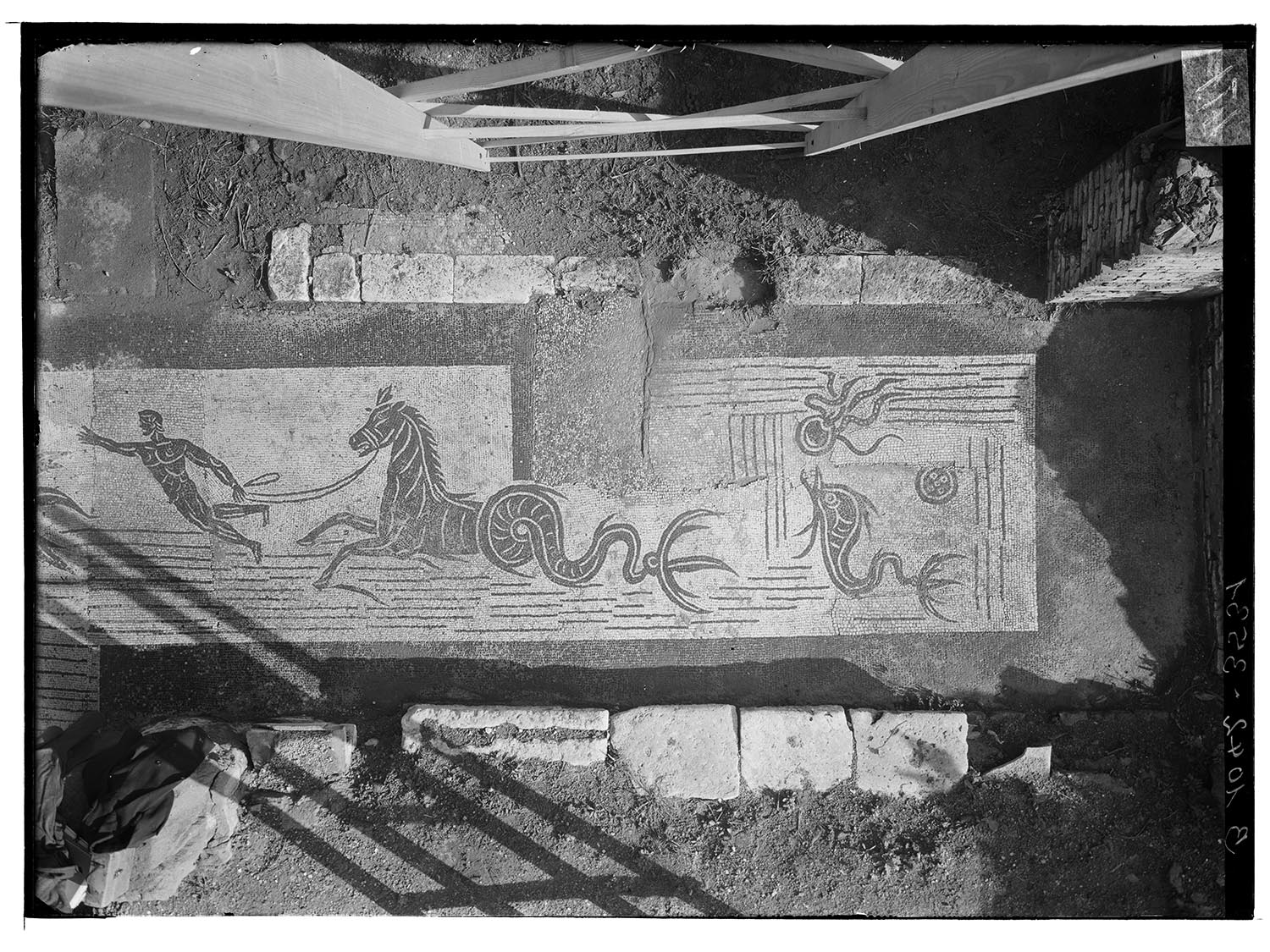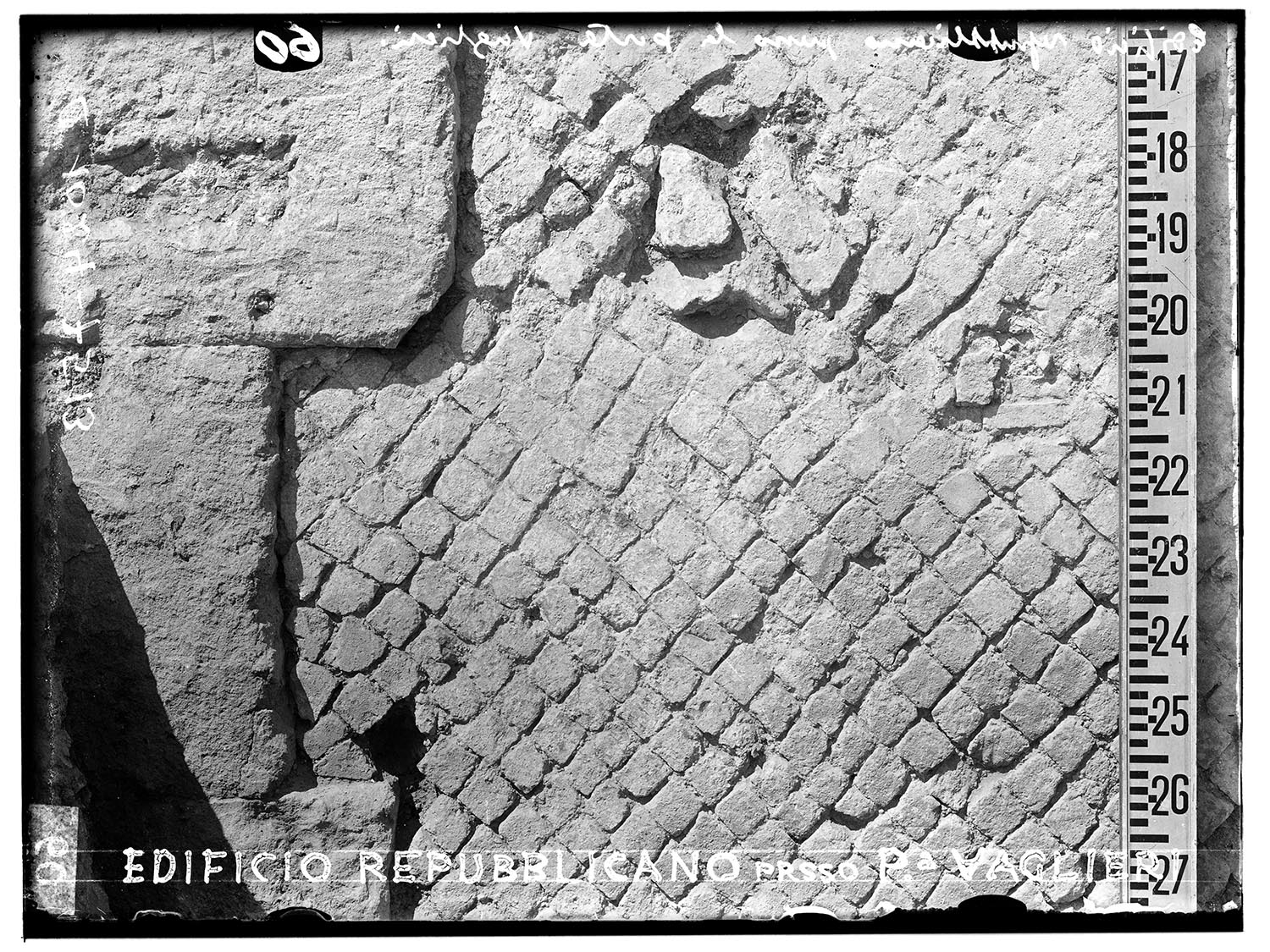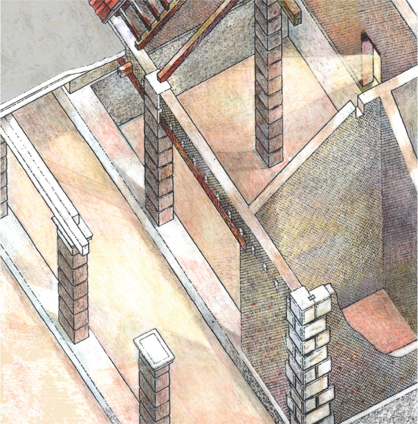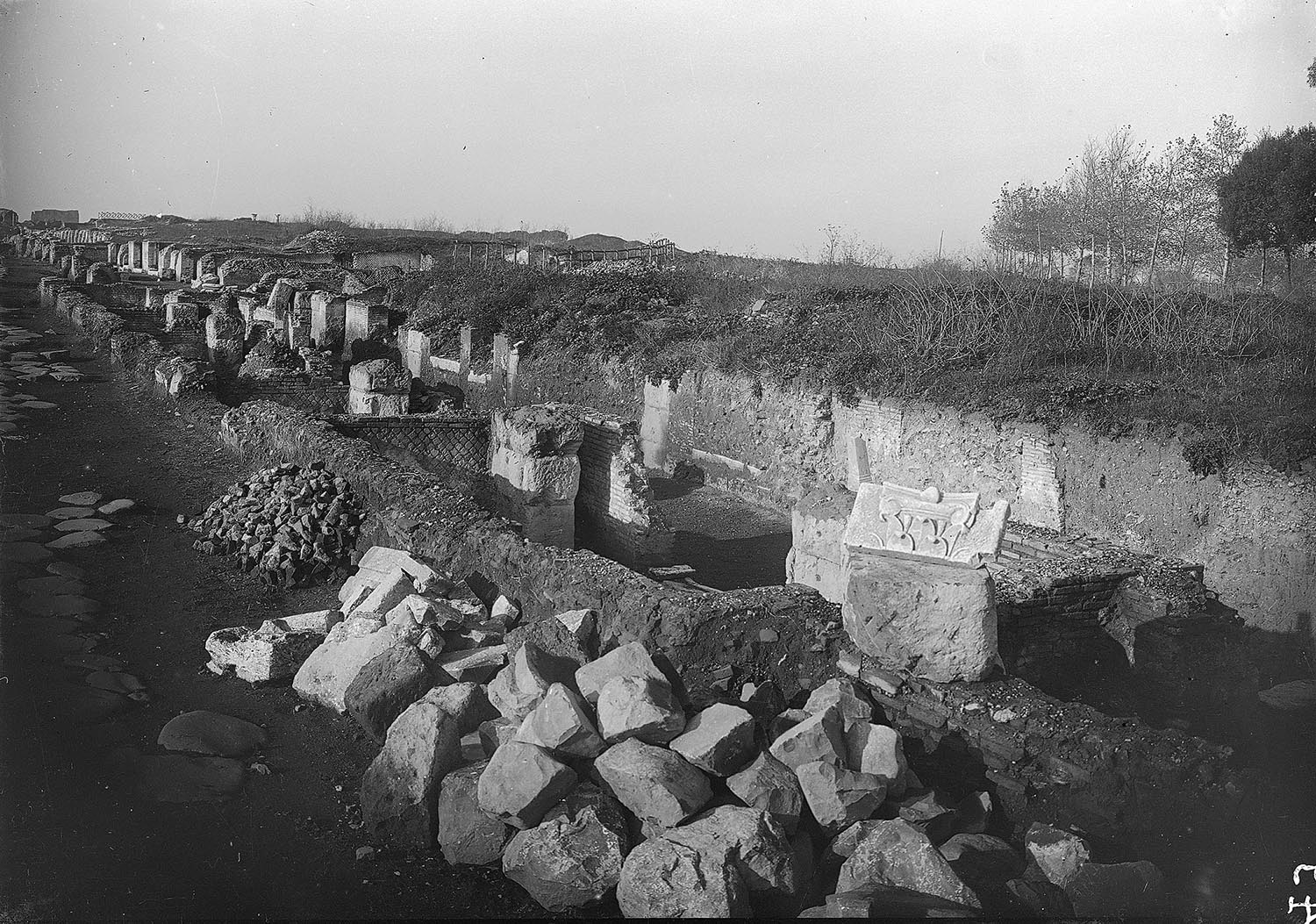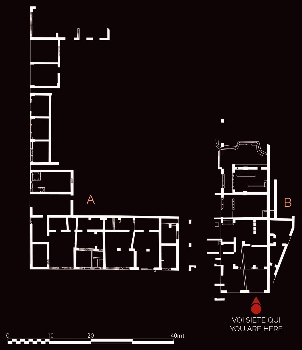The commercial complex was built at the end of the 1st century BC, probably in connection with the river port to its north. During the first phase, it consisted of a rectangular building in opus quasi reticulatum surrounded by a portico with tufa pillars (A). Also connected to the warehouses was the Caseggiato del Cane Monnus (B), which had tabernae (shops) opening onto a portico. In the Imperial period, the warehouses underwent a series of radical alterations, the most important of which was the transformation of their northern part into the Terme dei Cisiarii; the original internal level, lower than that of the surrounding buildings, probably remained unchanged.