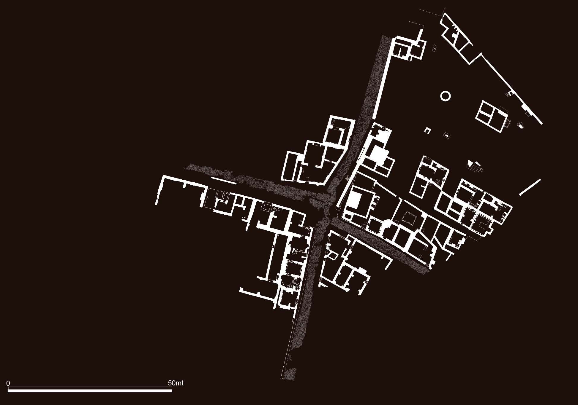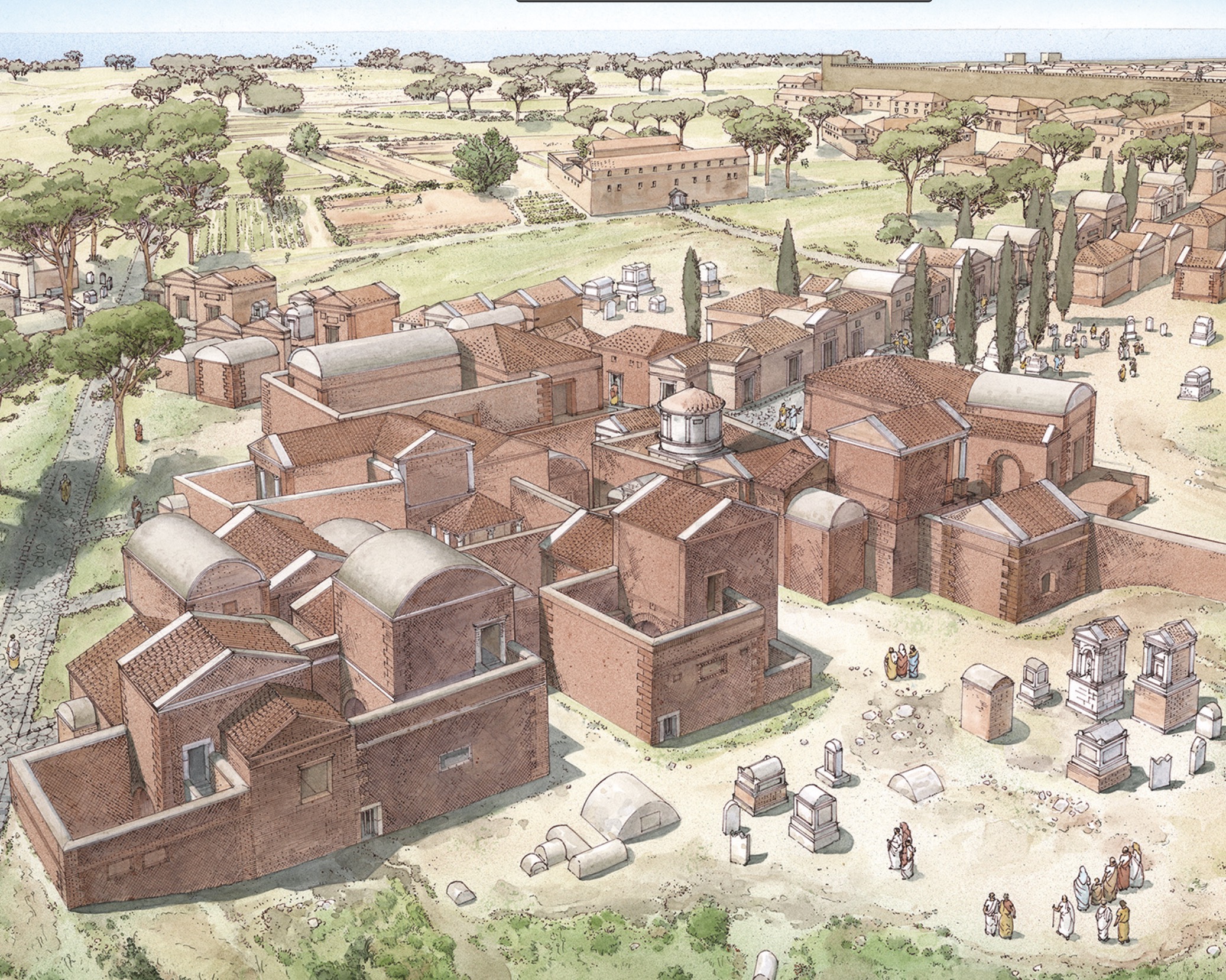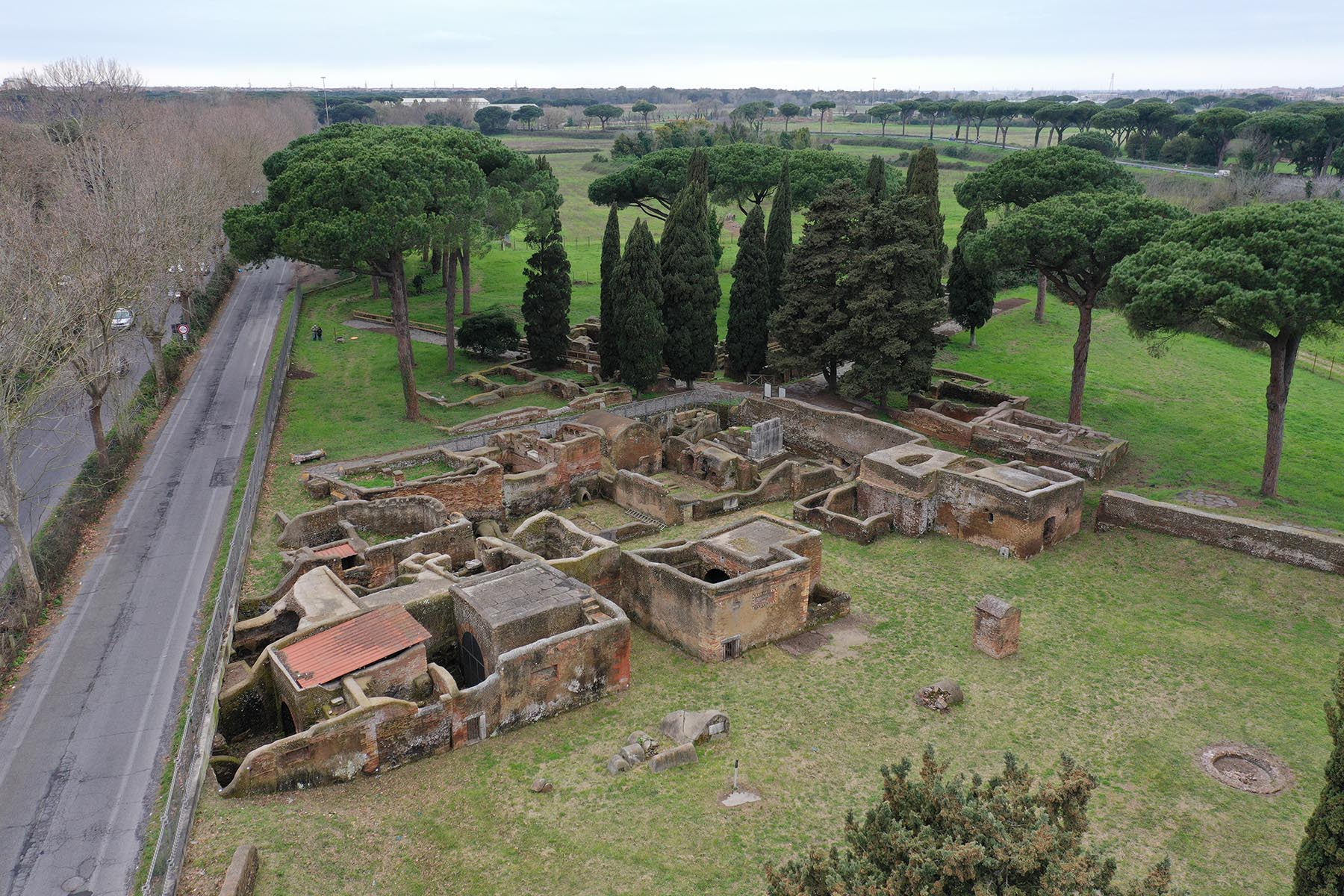 The tombs visible today are a small part of the larger burial ground that stretched south of Ostia along the Via Laurentina; the funerary buildings, arranged on several levels, were aligned along the Via Laurentina and the connected roads, delimiting to the north a large plaza dotted with more modest burials.