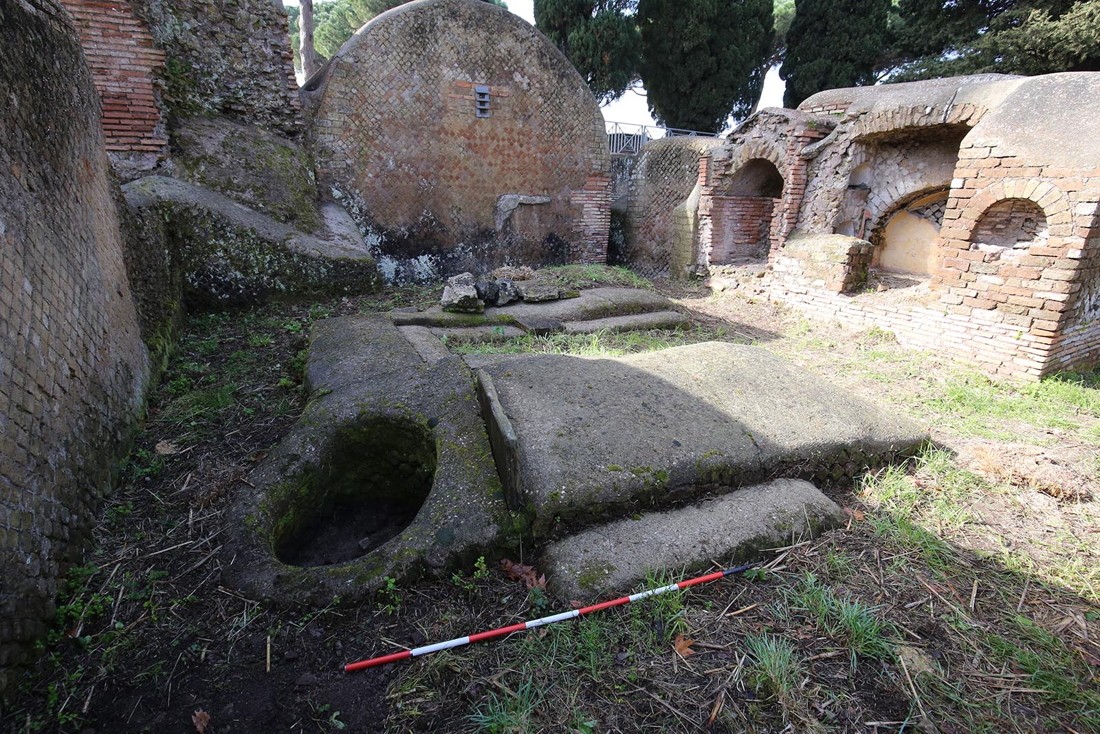 The Laurentina Necropolis offers rich documentation of the rituals connected to death and burial in the Roman world. As elsewhere, the practices of interment and cremation coexisted since the Late Republic, with the latter ritual prevailing until the 2nd century AD. Cremation took place generally in a specially arranged area near the tombs or inside them (ustrinum); the ashes were then deposited in urns or ollas placed in the ground or in loculi that opened onto the tombs’ walls. Interment involved deposition in simple fossae in the ground, inside sarcophagi, or more rarely inside amphorae (enchytrismos); however, after the 2nd century AD, the practice spread of burial inside constructed fossae (formae) or large niches dug into the walls (arcosolia) of tomb buildings. The presence of funerary triclinia, wells, and ovens found in many tombs is relate to the banquets that were held on the occasion of funerals, holidays, and festivities connected with the cult of the dead.
