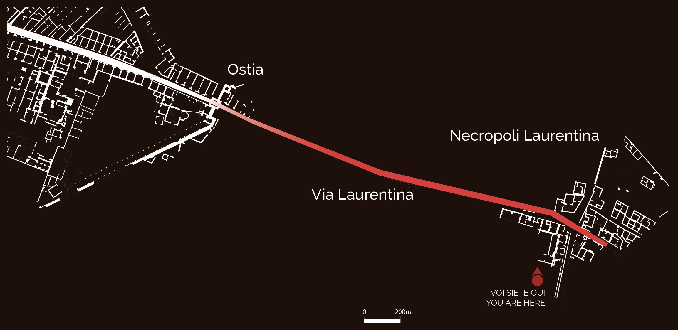 Until the construction of the coastal Via Severiana in the early 3rd century AD, Via Laurentina (which took its name of the variously identified city of Laurentum) was the main link between Ostia and southern Latium. Oriented in a northwest/southwest axis, the road entered the city from the gate that opened on the southern side of the city walls, its urban stretch serving as cardo maximus. In the section outside the city, the road traversed the southern agricultural suburb and, like Via Ostiense, was flanked by rows of tombs in uninterrupted succession to the Pianabella area.