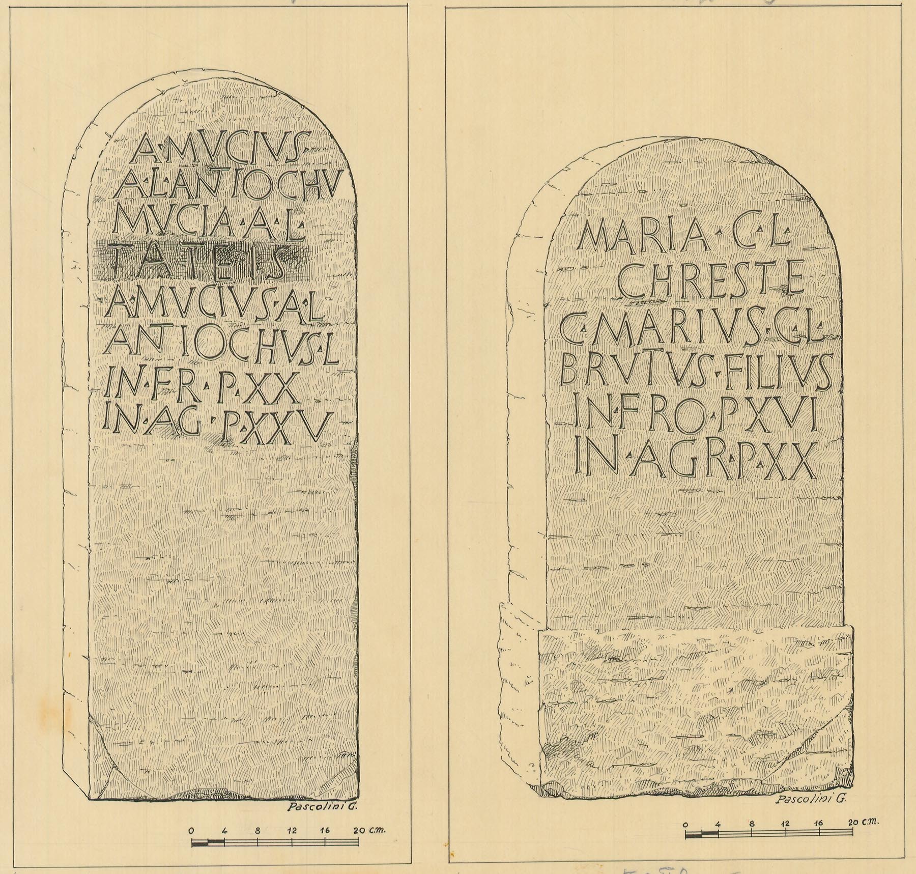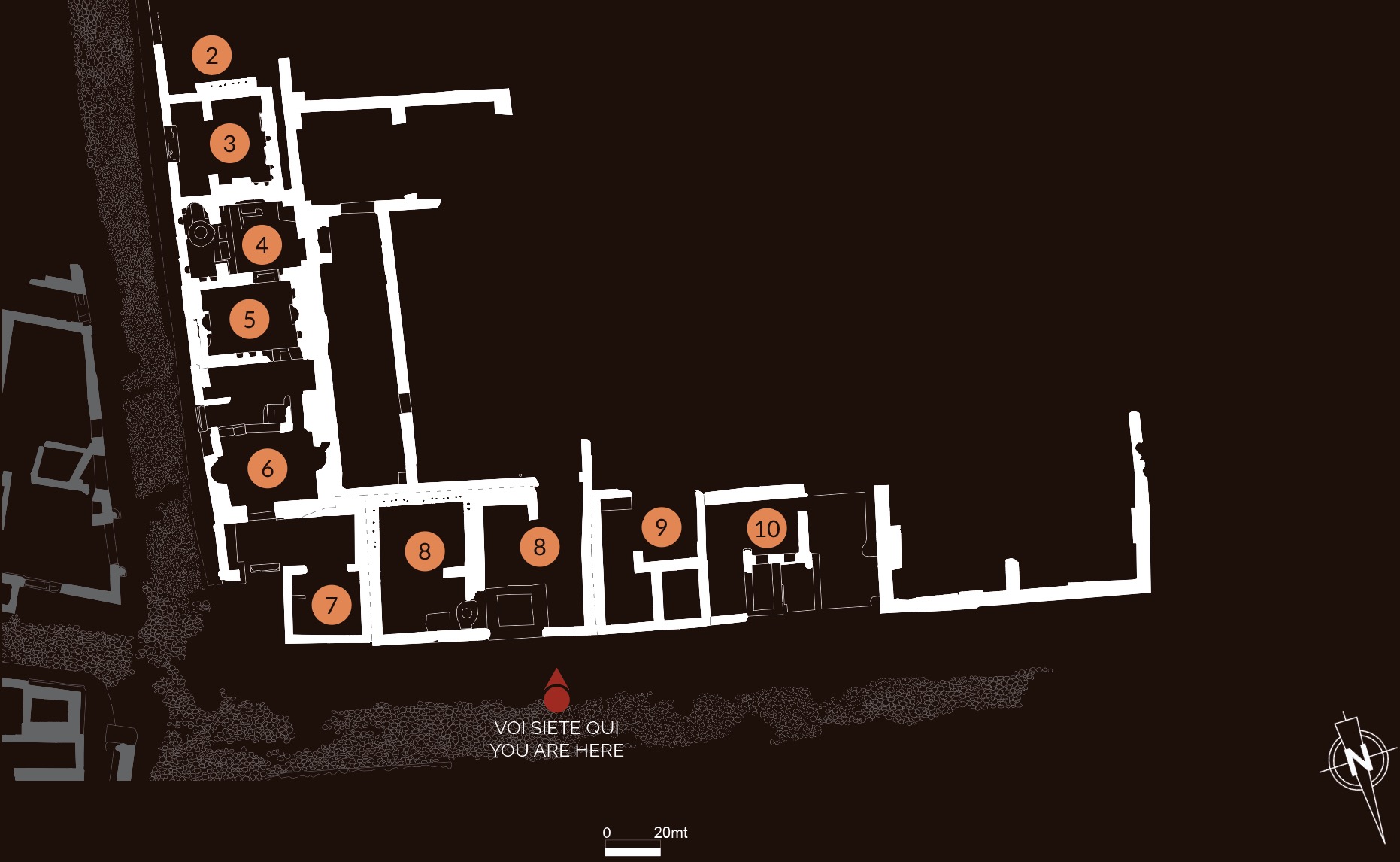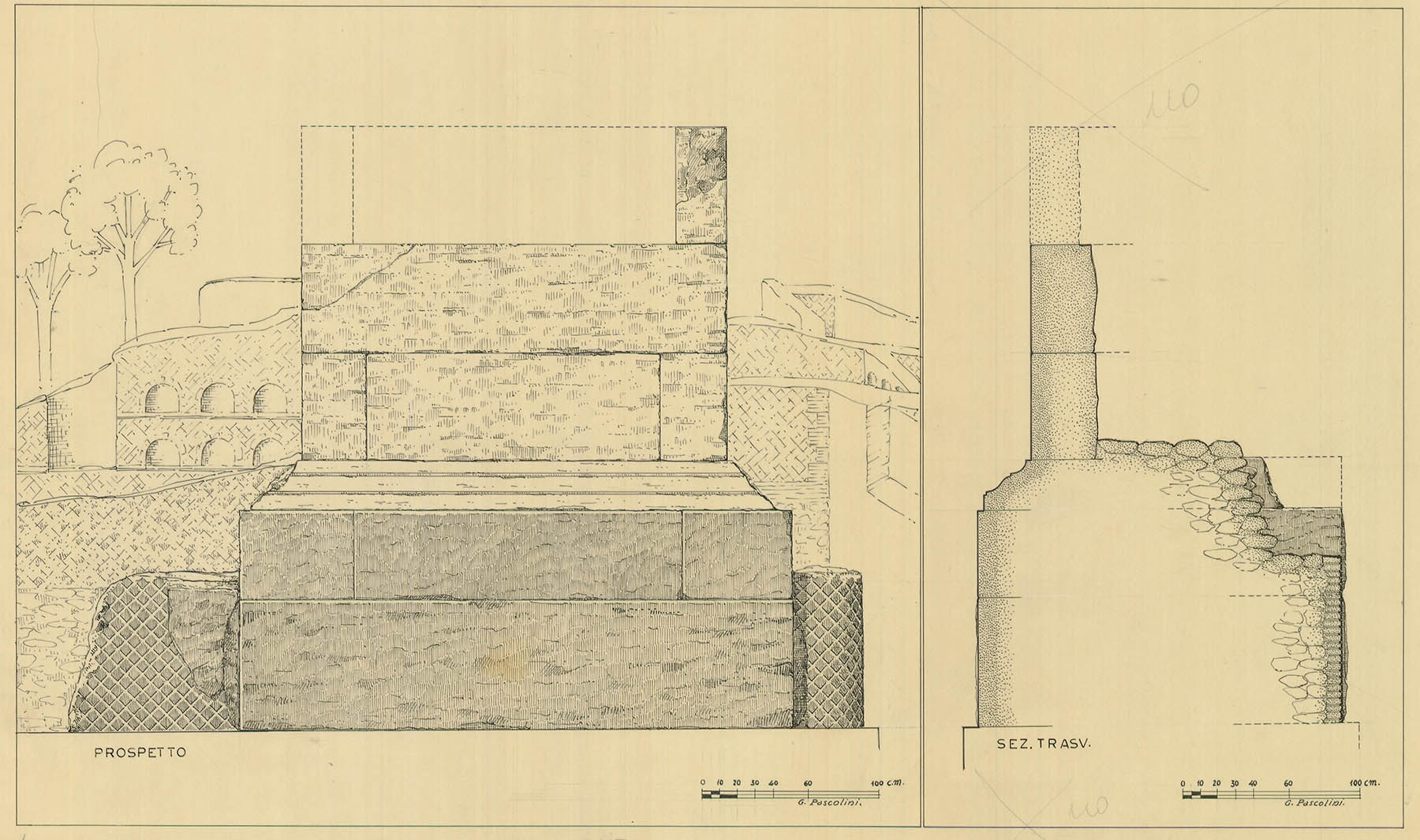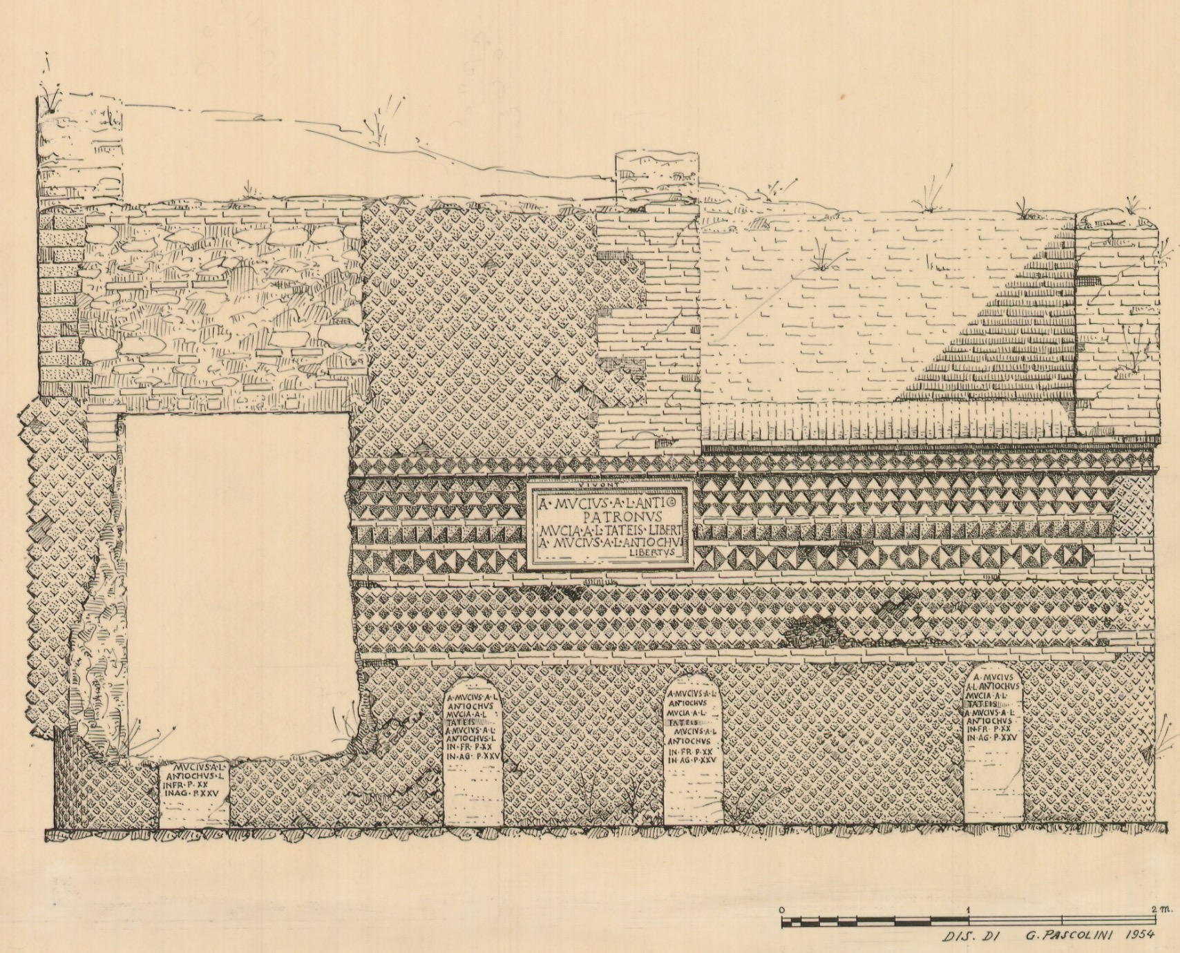 Placed to the west of the intersection between Via Laurentina and a secondary road, these tombs bear eloquent testimony to the stratification of funerary buildings belonging to the different phases in the life of the necropolis. In fact, placed on top of the funerary enclosures in opus reticulatum work with stelae or monuments inserted into the façade (late 1st century BC – early 1st century AD) are later columbaria (2nd – 3rd century AD) in opus mixtum, opus latericium, or opus vittatum, witih niches and arcosolia. Among the burial sites from the oldest phase, Tomb 9 stands out for the refined decoration of the façade, obtained thanks to the use of bricks, tuff stone, and pumice.