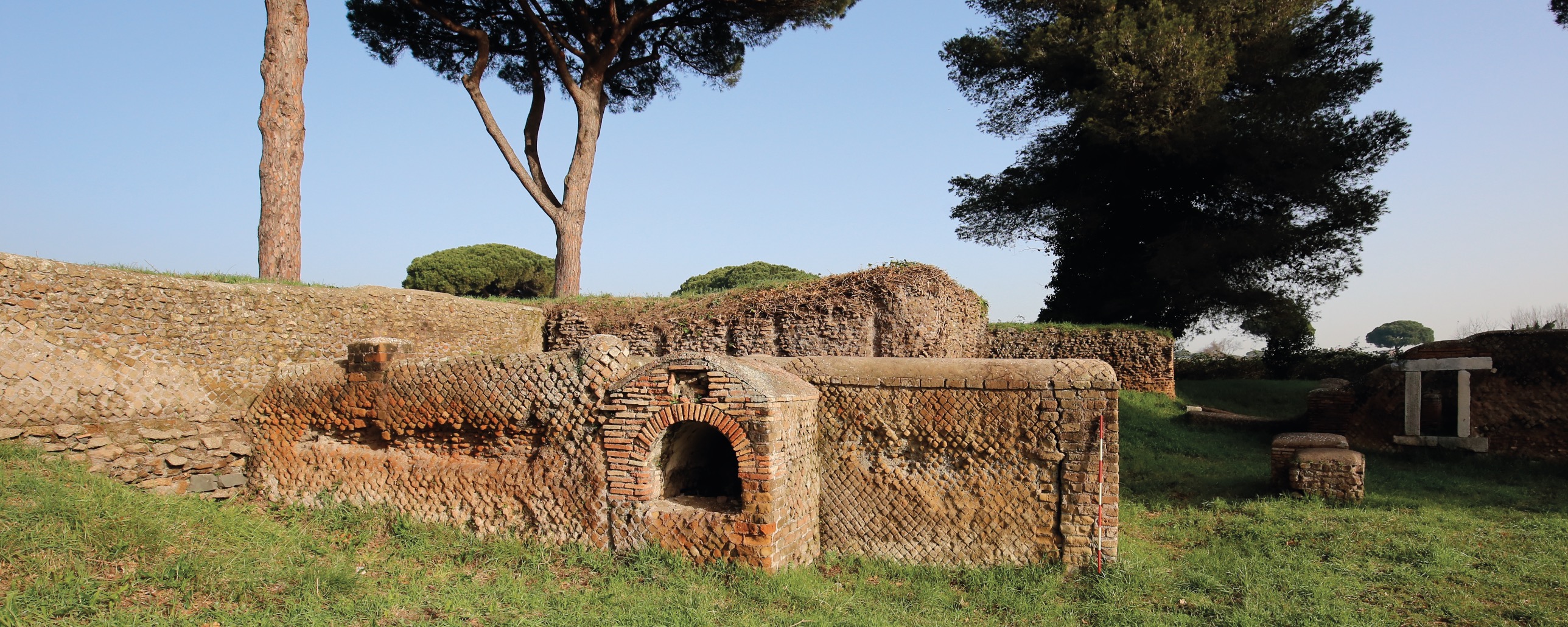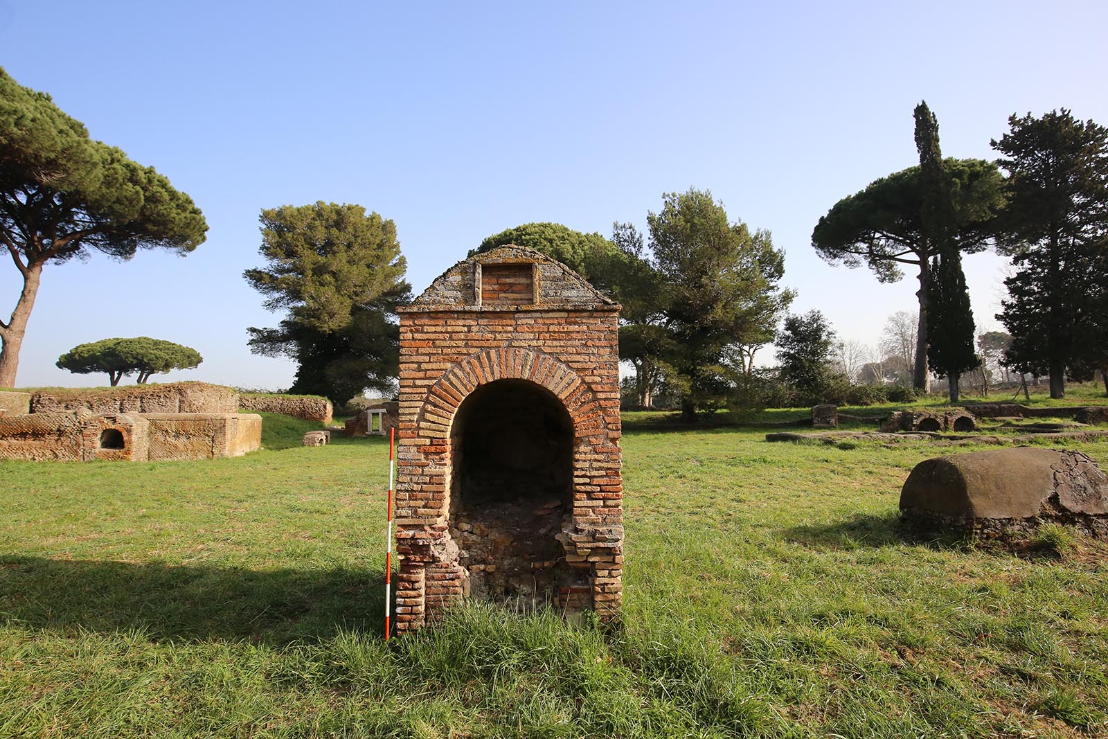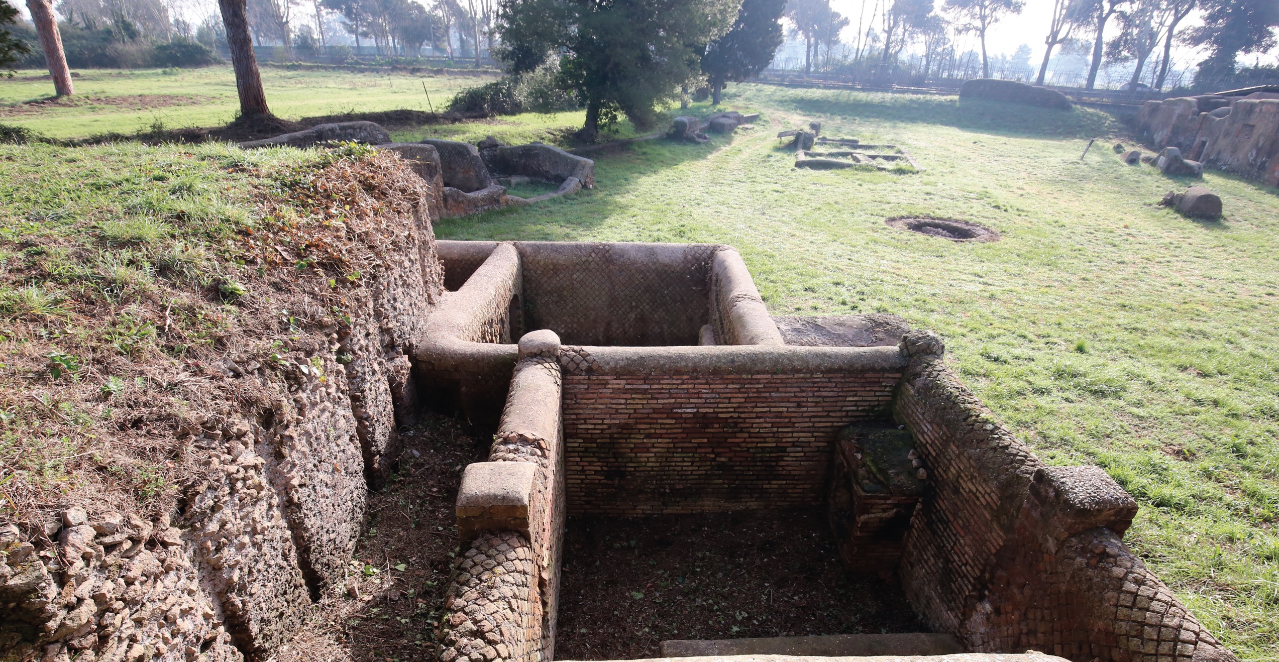 These tombs, placed to the sides and at the centre of the plaza that marks the northern limit of the archaeological area, present extreme chronological and typological variety. While the northern side is defined by funerary enclosures in opus reticulatum from the Augustan Age (Tombs 41 and 43), the central area is occupied mainly by caisson tombs that may be dated to the second half of the 1st century AD (Tombs 35-38), interspersed by rarer types, like the circular-plan enclosure (Tomb 40) and the frescoed funerary aedicule (Tomb 39). The discovery of interments in fossa and in amphorae suggests that the area was also used for more modest burials.
