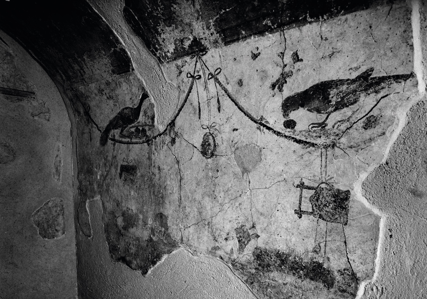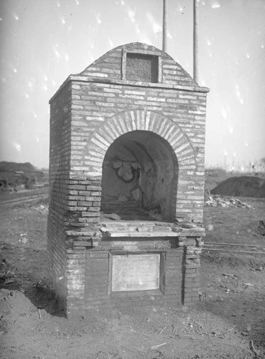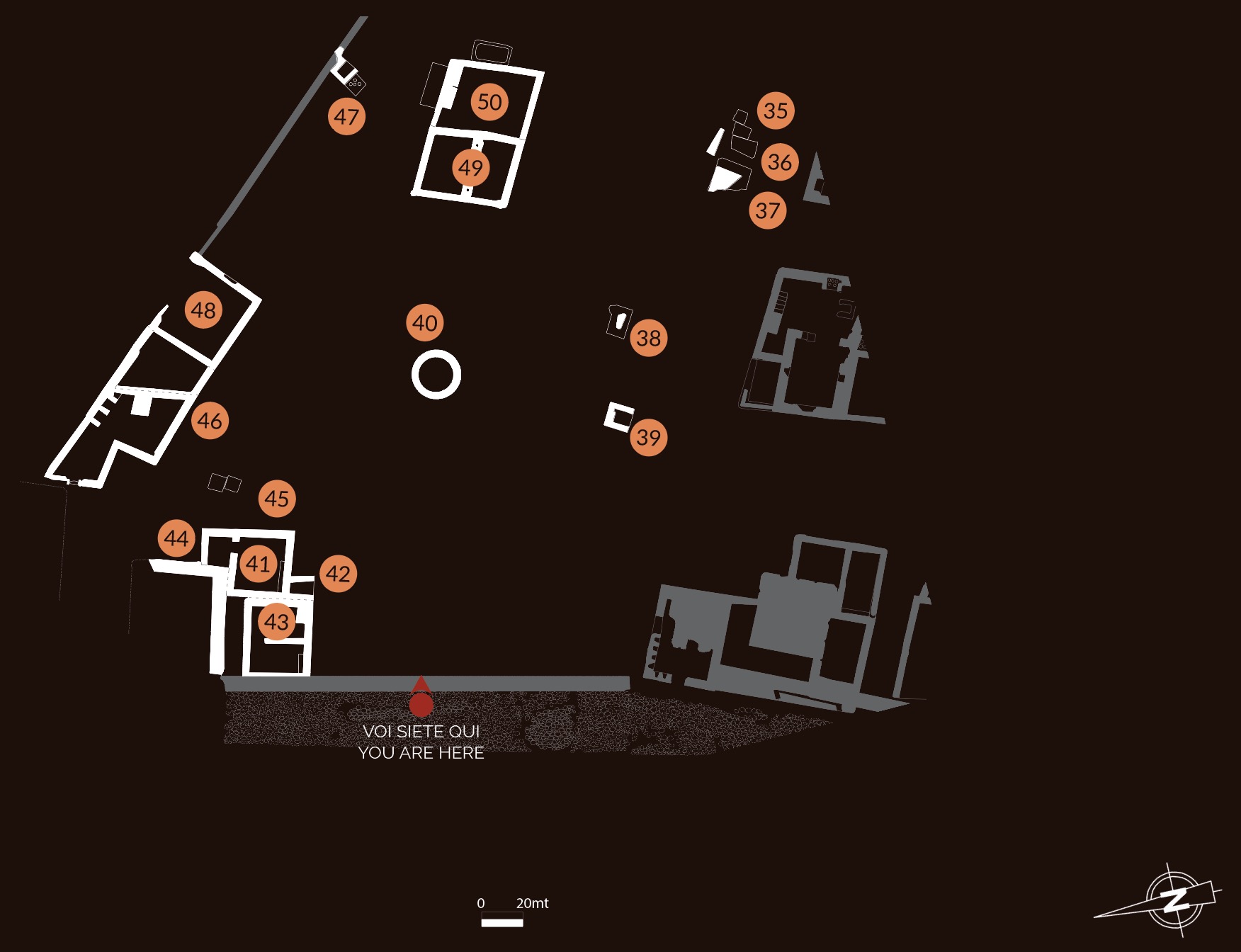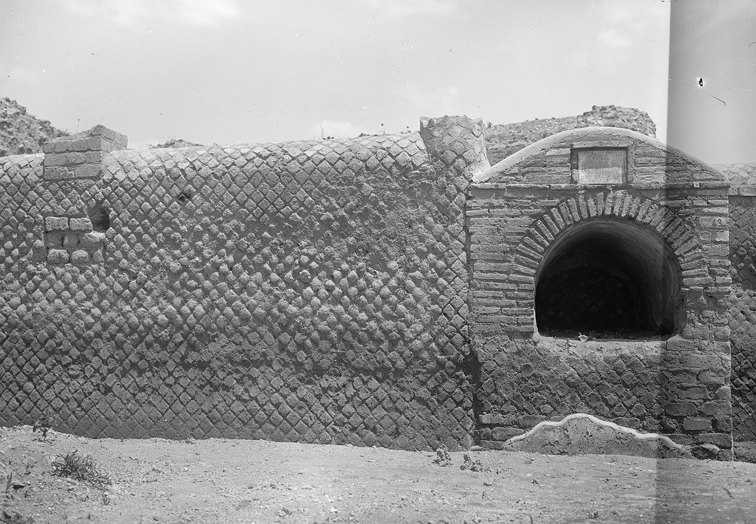 These tombs, placed to the sides and at the centre of the plaza that marks the northern limit of the archaeological area, present extreme chronological and typological variety. While the northern side is defined by funerary enclosures in opus reticulatum from the Augustan Age (Tombs 41 and 43), the central area is occupied mainly by caisson tombs that may be dated to the second half of the 1st century AD (Tombs 35-38), interspersed by rarer types, like the circular-plan enclosure (Tomb 40) and the frescoed funerary aedicule (Tomb 39). The discovery of interments in fossa and in amphorae suggests that the area was also used for more modest burials.
