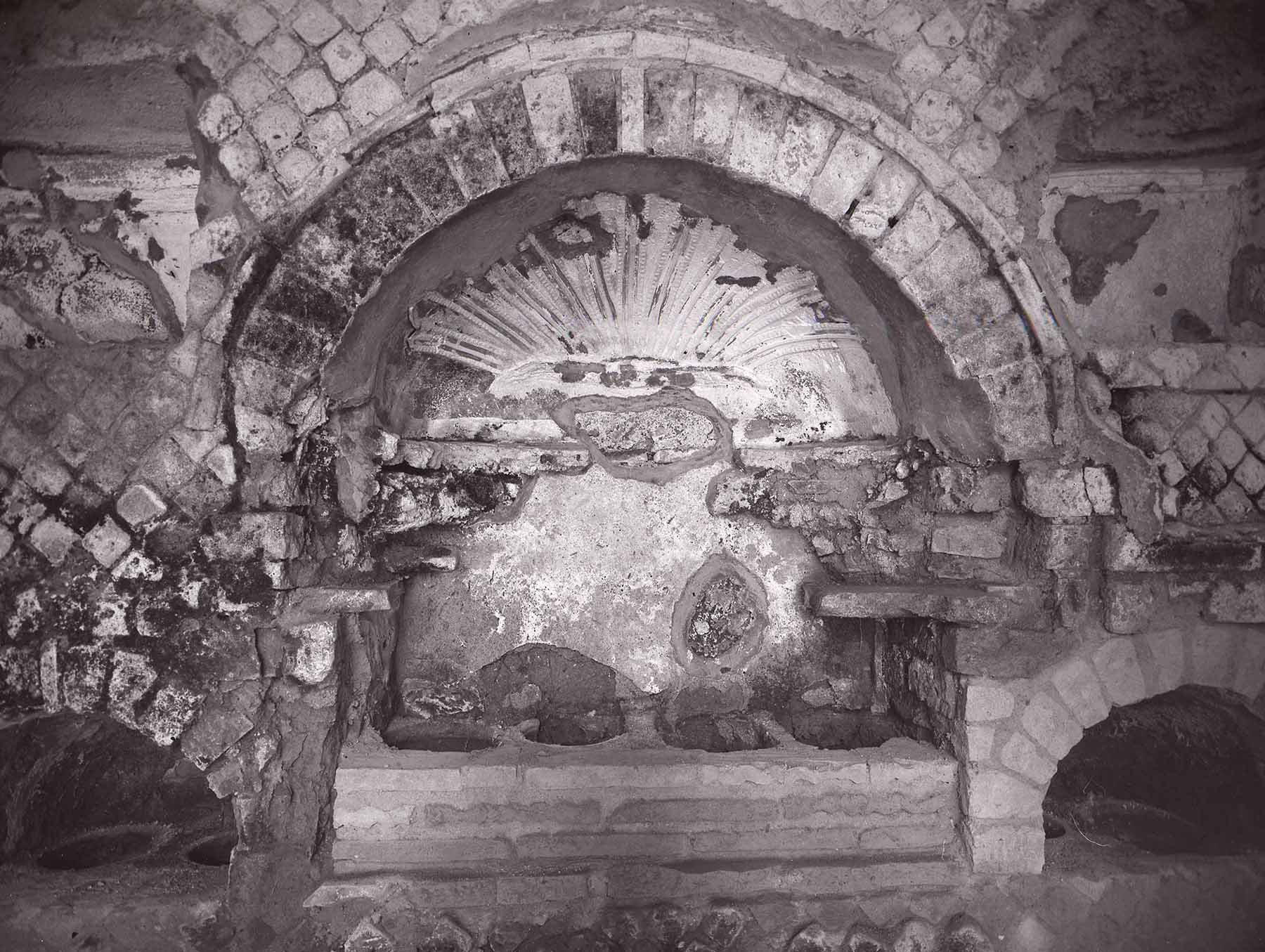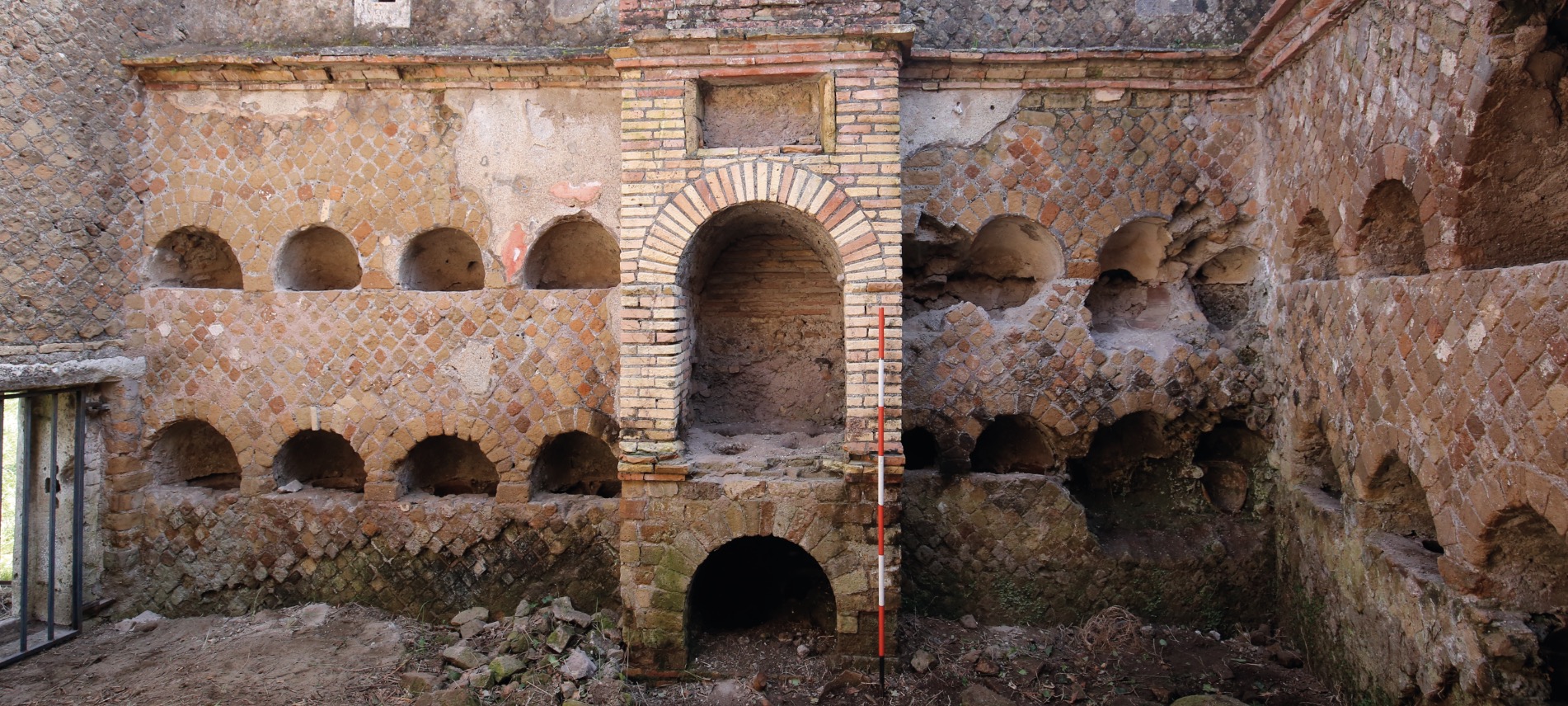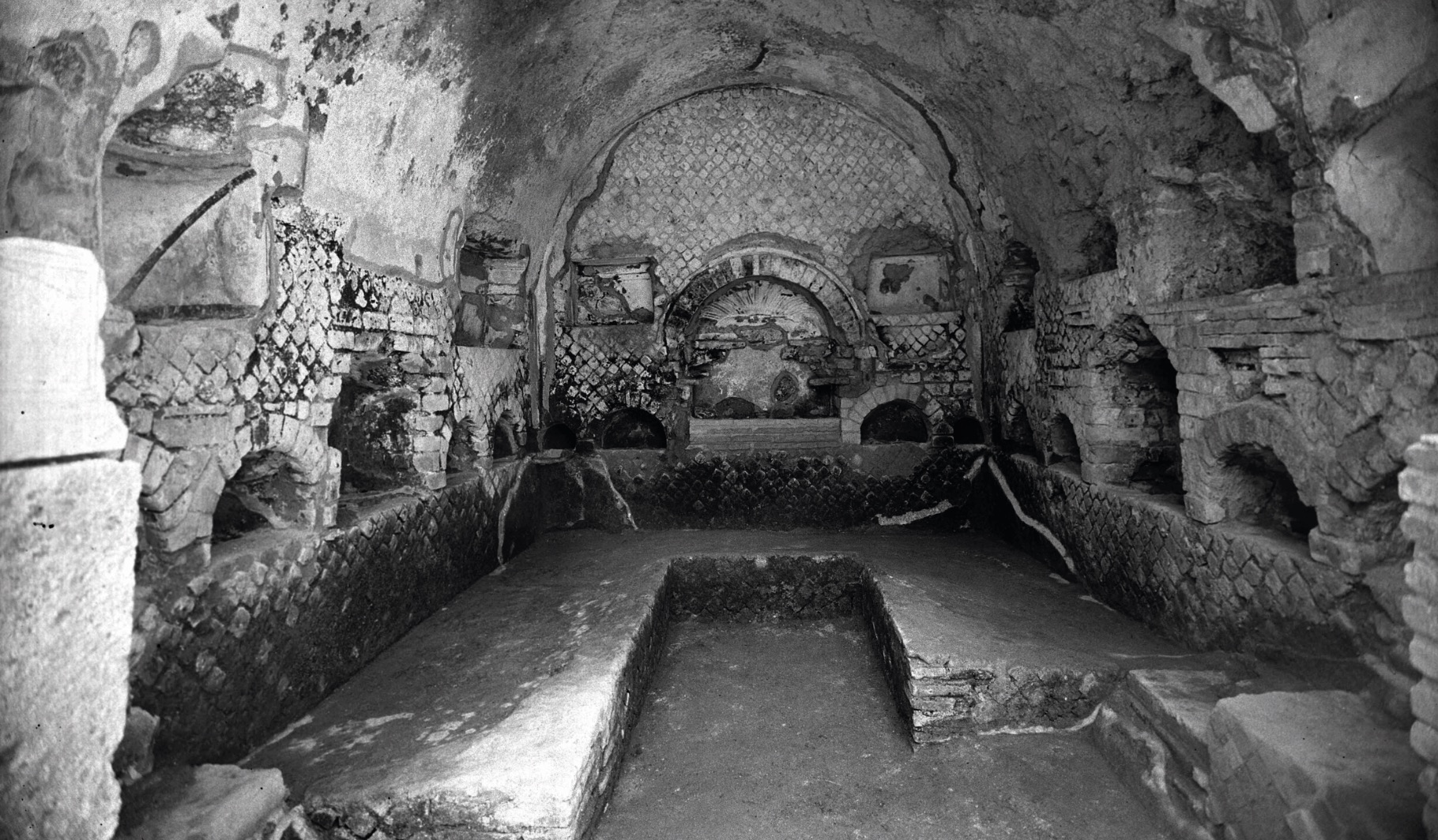 Tomb 32, built between the late 1st century BC – early 1st century AD, is a kind of prototype for the nearby columbaria, from which it is distinguished by the presence of the ustrinum, adjacent to but separate from the main body. Its interior organized like the nearby Tomb 33, its façade bore the inscription of the owner C(aius) Iulius Pothi l(ibertus) Amethystus, in a brick and pumice frame flanked by two reliefs decorated with winged phalli (now lost). The numerous inscriptions referring to freedmen of Emperor Claudius and the presence of arcosolia attest that the tomb remained in use until the 2nd-3rd century AD.