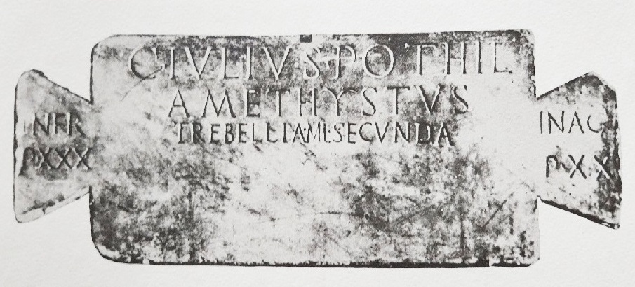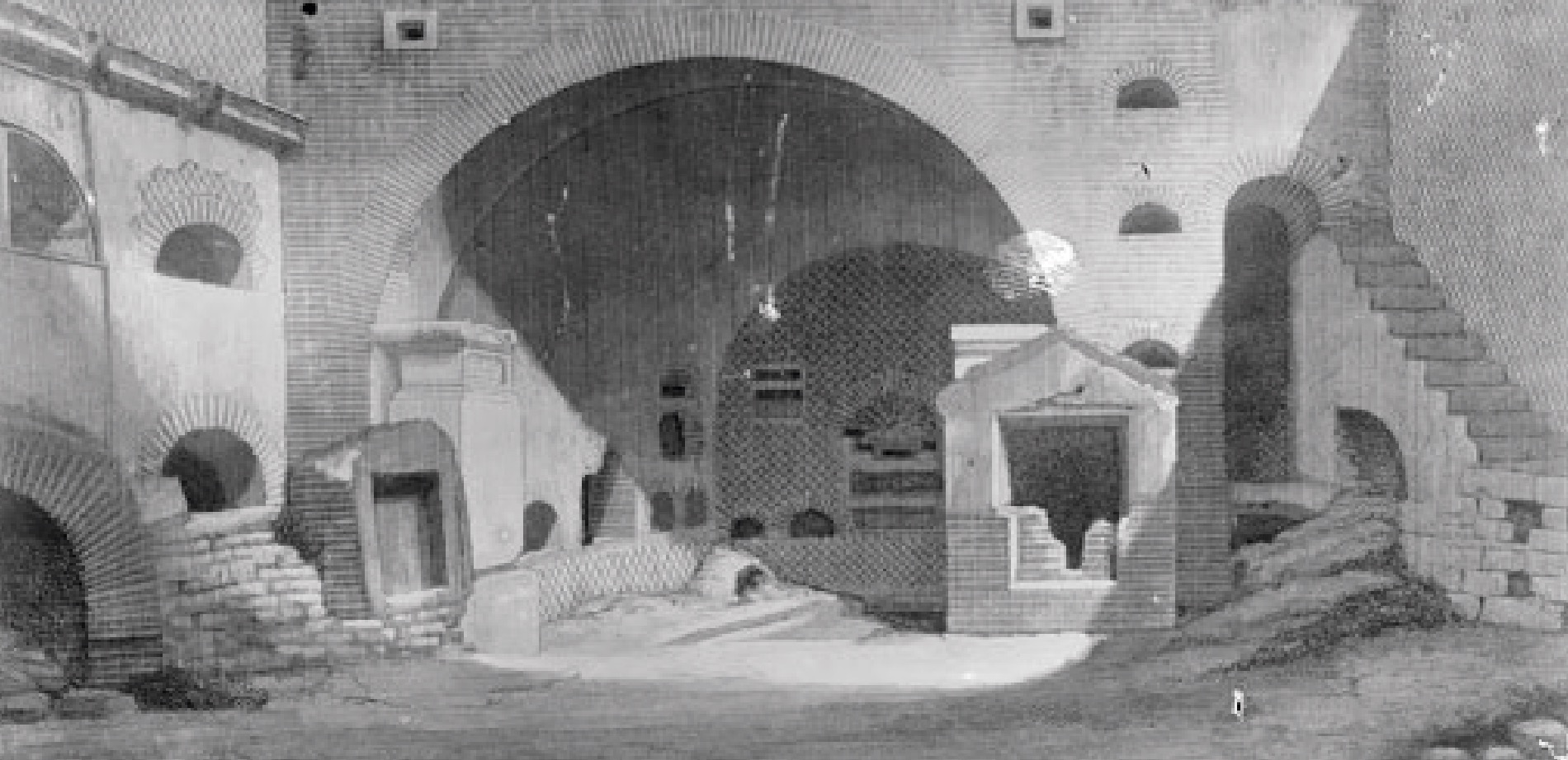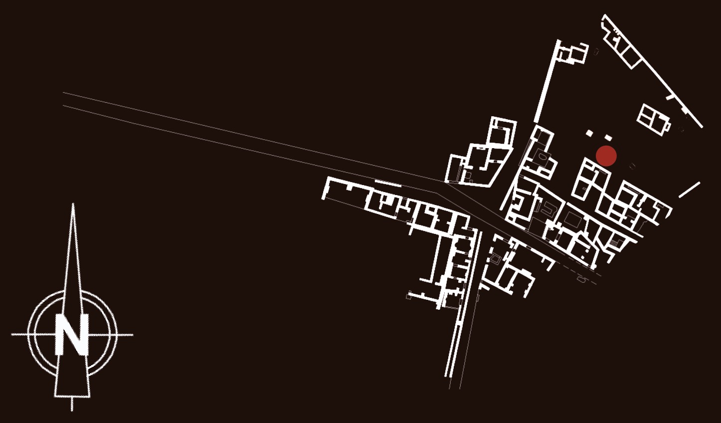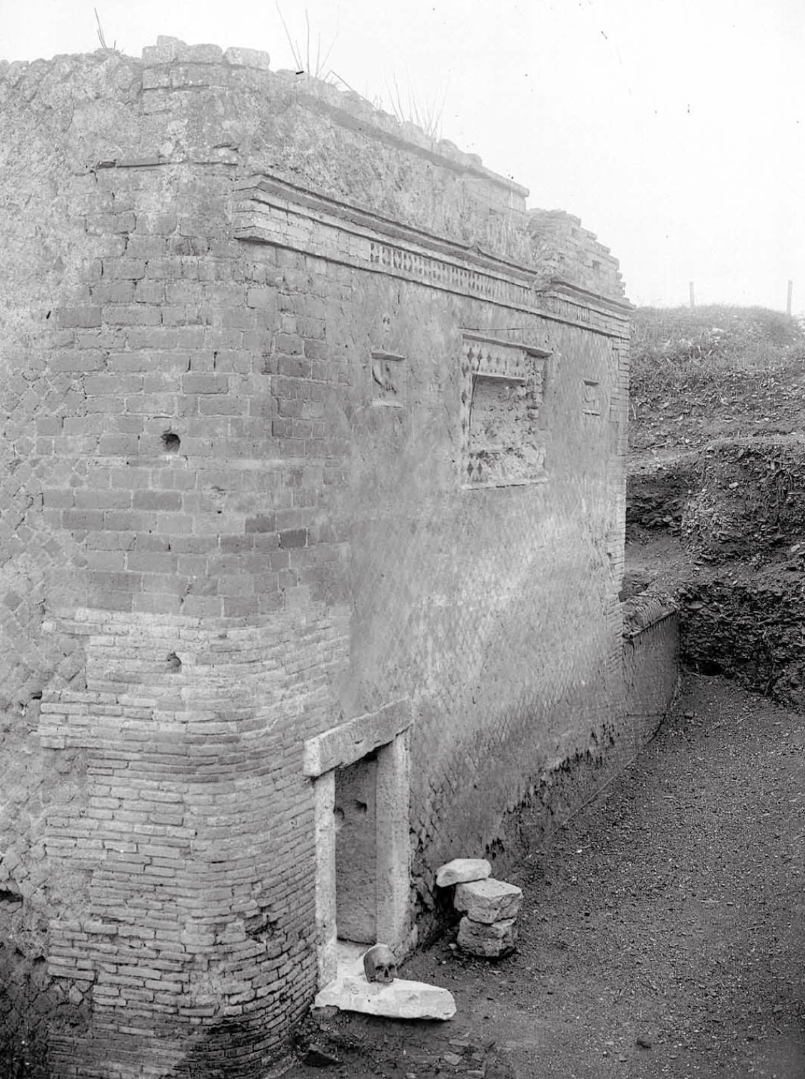 Tomb 32, built between the late 1st century BC – early 1st century AD, is a kind of prototype for the nearby columbaria, from which it is distinguished by the presence of the ustrinum, adjacent to but separate from the main body. Its interior organized like the nearby Tomb 33, its façade bore the inscription of the owner C(aius) Iulius Pothi l(ibertus) Amethystus, in a brick and pumice frame flanked by two reliefs decorated with winged phalli (now lost). The numerous inscriptions referring to freedmen of Emperor Claudius and the presence of arcosolia attest that the tomb remained in use until the 2nd-3rd century AD.