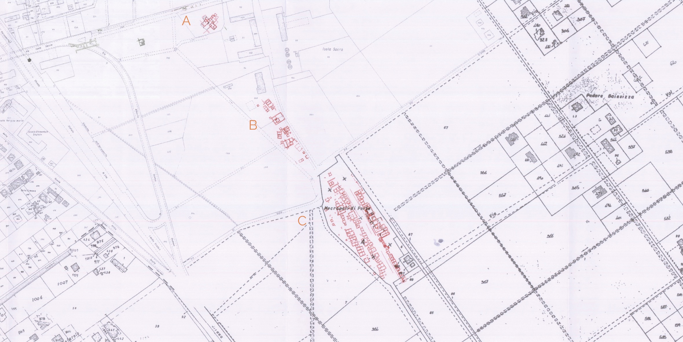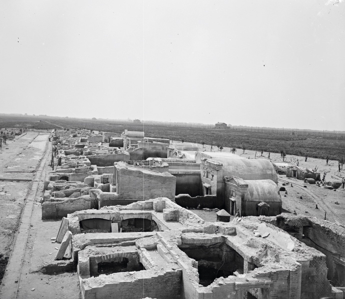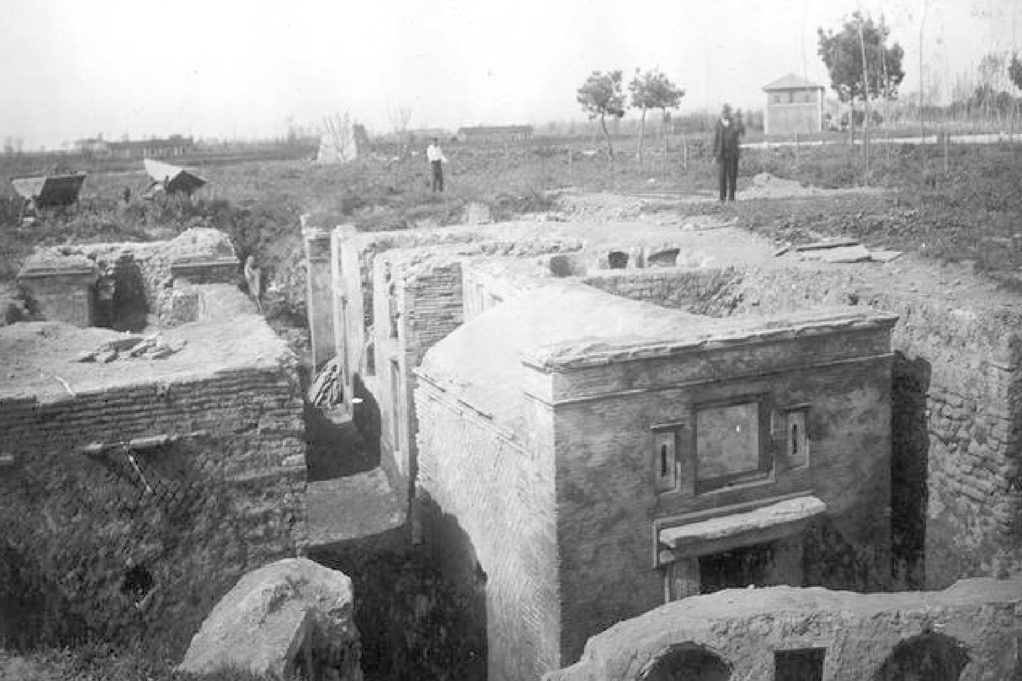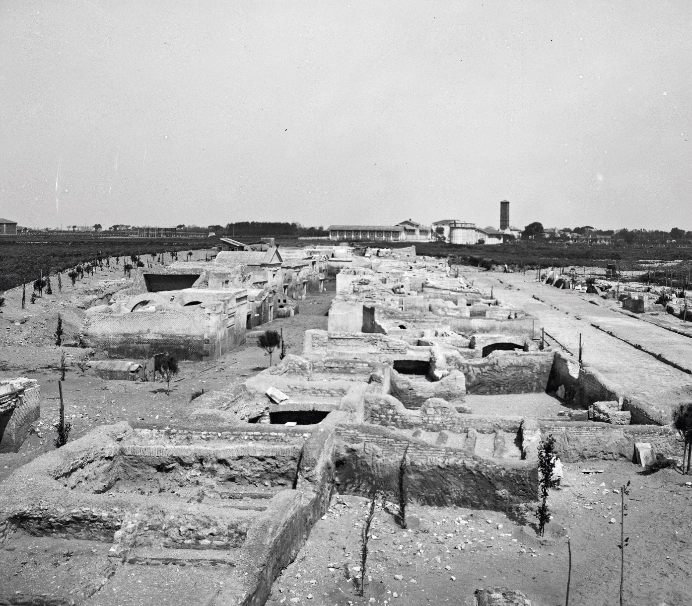 In the 1920s, during the works to drain the territory and the construction of farm houses in the area assigned to the veterans’ organization Opera Nazionale Combattenti (O.N.C.), tombs decorated with paintings, stuccowork, and mosaics, which to this day constitute the northernmost nucleus of the Necropolis (A), were discovered under the direction of Guida Calza. This initial discovery was followed by the systematic excavation, also conducted by Calza, of the settlement’s vast southern area (C). Between these two nuclei, another group of tombs (B) was explored and reburied after their decorations were detached and transferred to the Depositi Ostiensi warehouse for conservation reasons due to the surface level of groundwater. The most ancient burial levels were identified in the western side during the stratigraphic investigations lead between 1968 and 1989 which allowed an extensive hydraulic reclamation intervention to be planned. Tombs on the western side are identified with progressive Arabic numerals (1, 2, 3, etc.) from south to north, while for graves on the eastern side the number is preceded by the letter E, indicating the cardinal point (east).