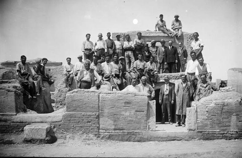 Historical photograph of the excavations of the southern sector of the Necropolis, with Guido Calza and workmen (1940)