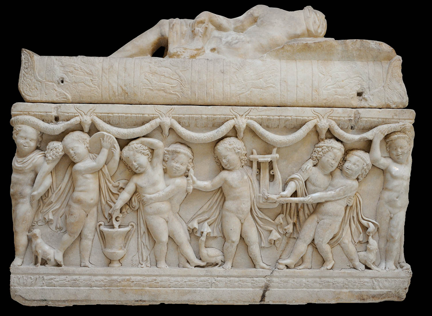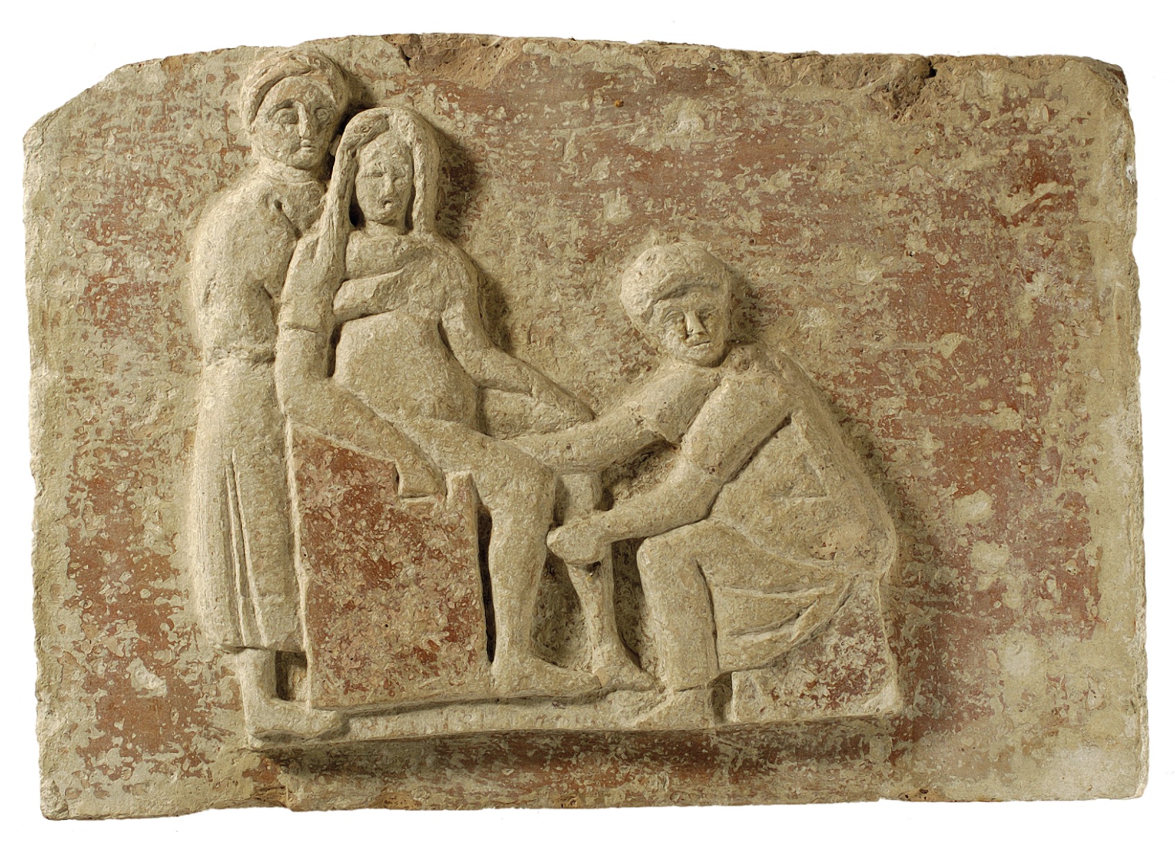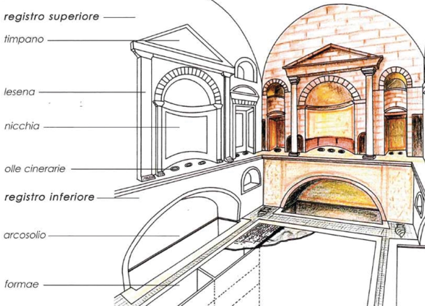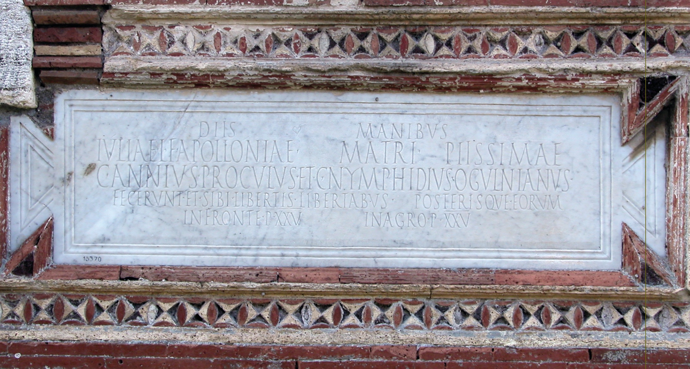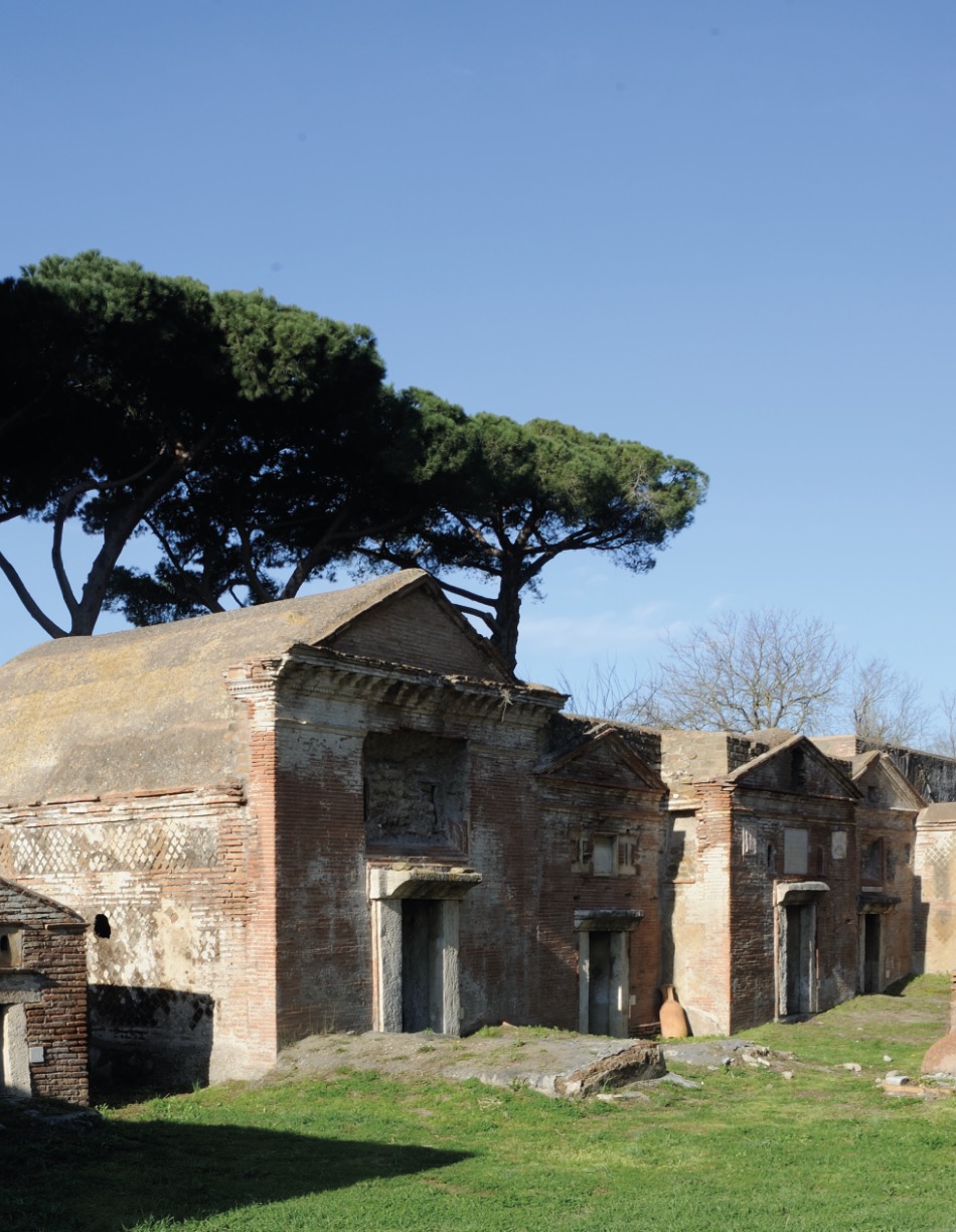 The choice of cremation or interment has no influence on the tomb’s outward appearance, but conditions its interior articulation: the lower register of the walls might house arcosolia for the interred, and the upper one niches containing ollas for the cremated. Beneath the floor, there are frequent formae – rectangular fossae delimited by low walls for the deposition of interments on several levels. The two rituals, resulting from individual choices even within a single family circle, coexisted throughout the Age of the Antonines (138-192 AD), with interment gradually prevailing during the 3rd century AD. Ledges are placed against the façade of some tombs; these were used as seats or klinai (beds), with an inclined plane and masonry supports for wooden boards. These preparations were functional to holding the funeral banquet, whose importance is underscored by the frequent presence, both inside monumental tombs and in connection with simple burials, of libation ducts made using amphora necks or hollow, rectangular-section bricks. As for the few grave goods that have been discovered, these come mostly from individual burials: small items of personal adornment, coins, glass unguentaria, and oil lamps. Finds of small, disc-shaped vases and clay incense burners are characteristic and frequent in connection with banquet preparations. On the tombs’ main front, between polychrome cornices in black pumice and reddish brick, marble slabs were placed, with Latin (less often Greek) inscriptions bearing the names of the owners, as well as indications on the size of the tomb and the regulations regarding its use. Sometimes the profession practised during life is illustrated by scenes depicted on clay tiles placed at the sides of the inscription. Studying these elements allows the deceased persons’ social class to be defined: a middle class consisting for the most part of freedmen engaged in trade and the crafts, the activities of broad strata of Portus’s population.