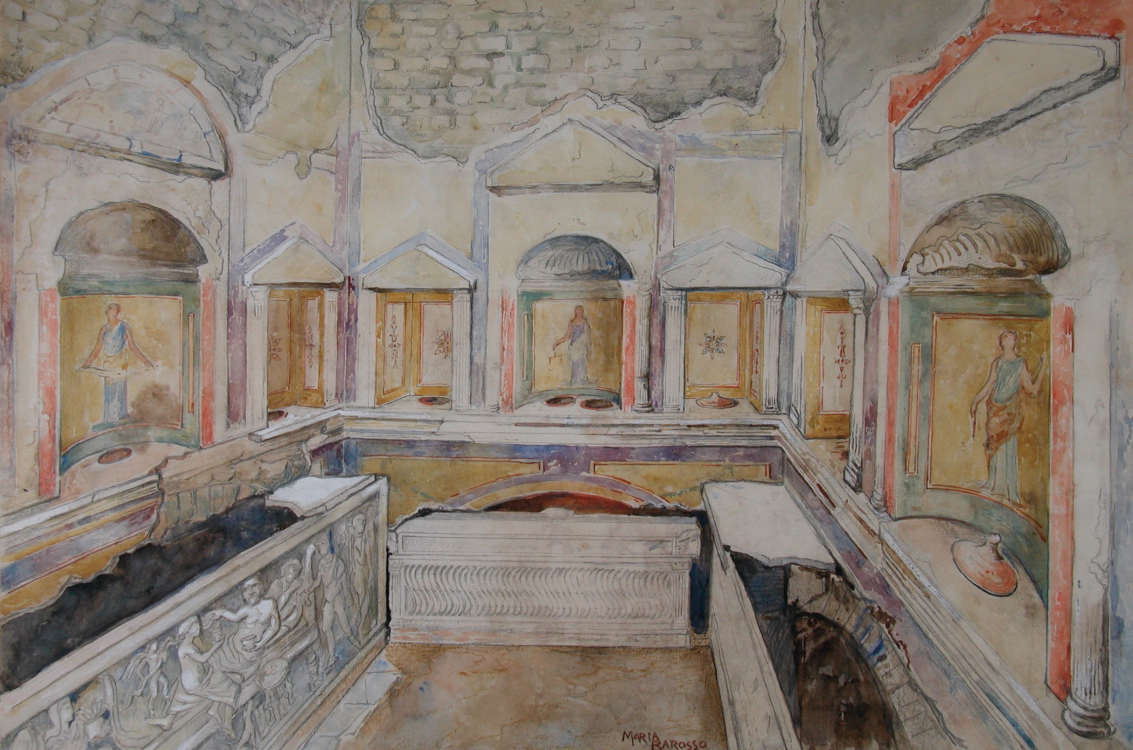 Tombs 2-9: cella-type tomb; their interiors present arcosolia in the walls and fossae delimited by low walls in the floors (formae), intended for the interred and dating to the first half of the 3rd century AD. The presence of “a cappuccina” or “hooded” and of caisson burials beneath Tombs 4, 5, 6, and 7 documents a phase of occupation of the previous road frontage. The excavation of Tomb 6 yielded the marble portrait of Volcacius Myropnous.