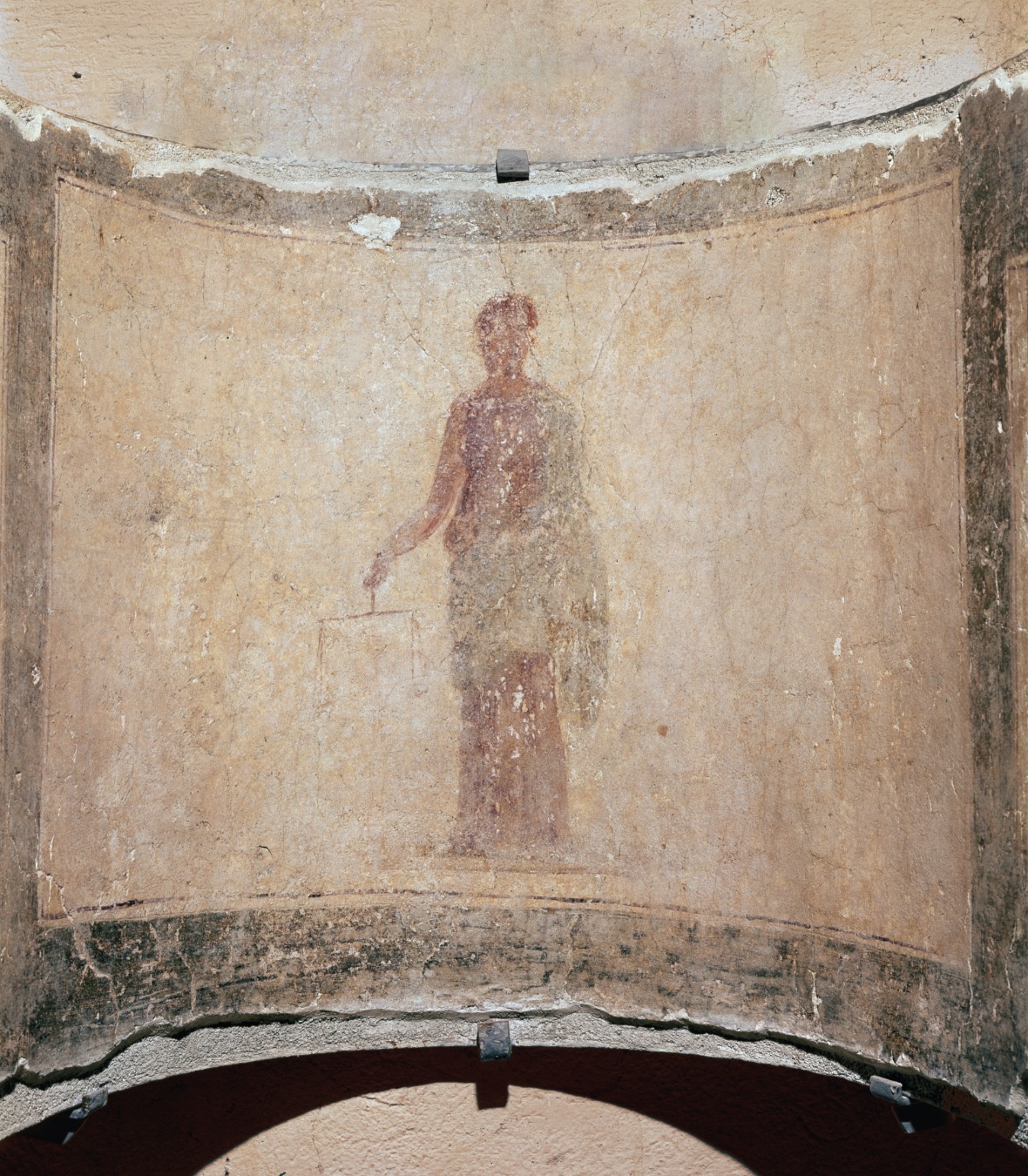 Tomb 11: cella-type tomb, with enclosure added later; its façade presents a Greek inscription with indications on the size of the tomb. Inside, the walls are organized for mixed rituals: arcosolia for interments in the lower register, niches containing ollas for the cremated in the upper one, formae for the interred beneath the pavement. The central niches were decorated with paintings depicting the Parcae, symbols of destiny.