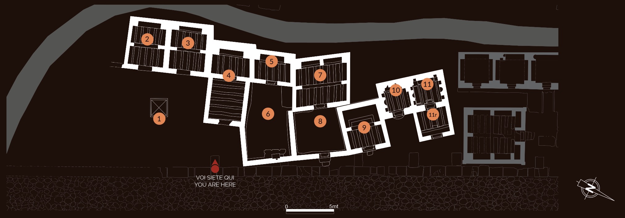 Tomb 10: dated to the second half of the 2nd century AD, its interior is articulated in arcosolia for the interred and niches with ollas for the cremated. On the entrance wall, the site of the inscription, with terracotta cornice, is framed by two slits, while the lateral recesses must have contained clay reliefs.