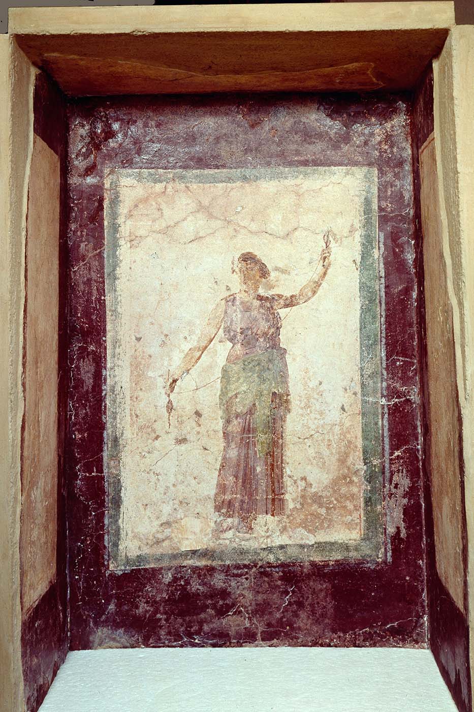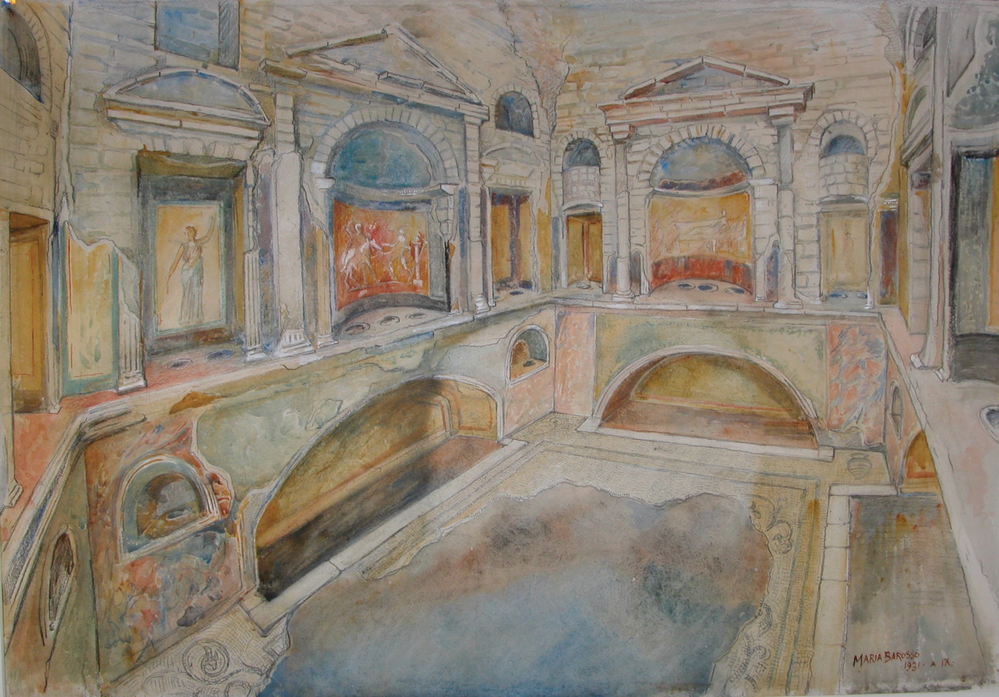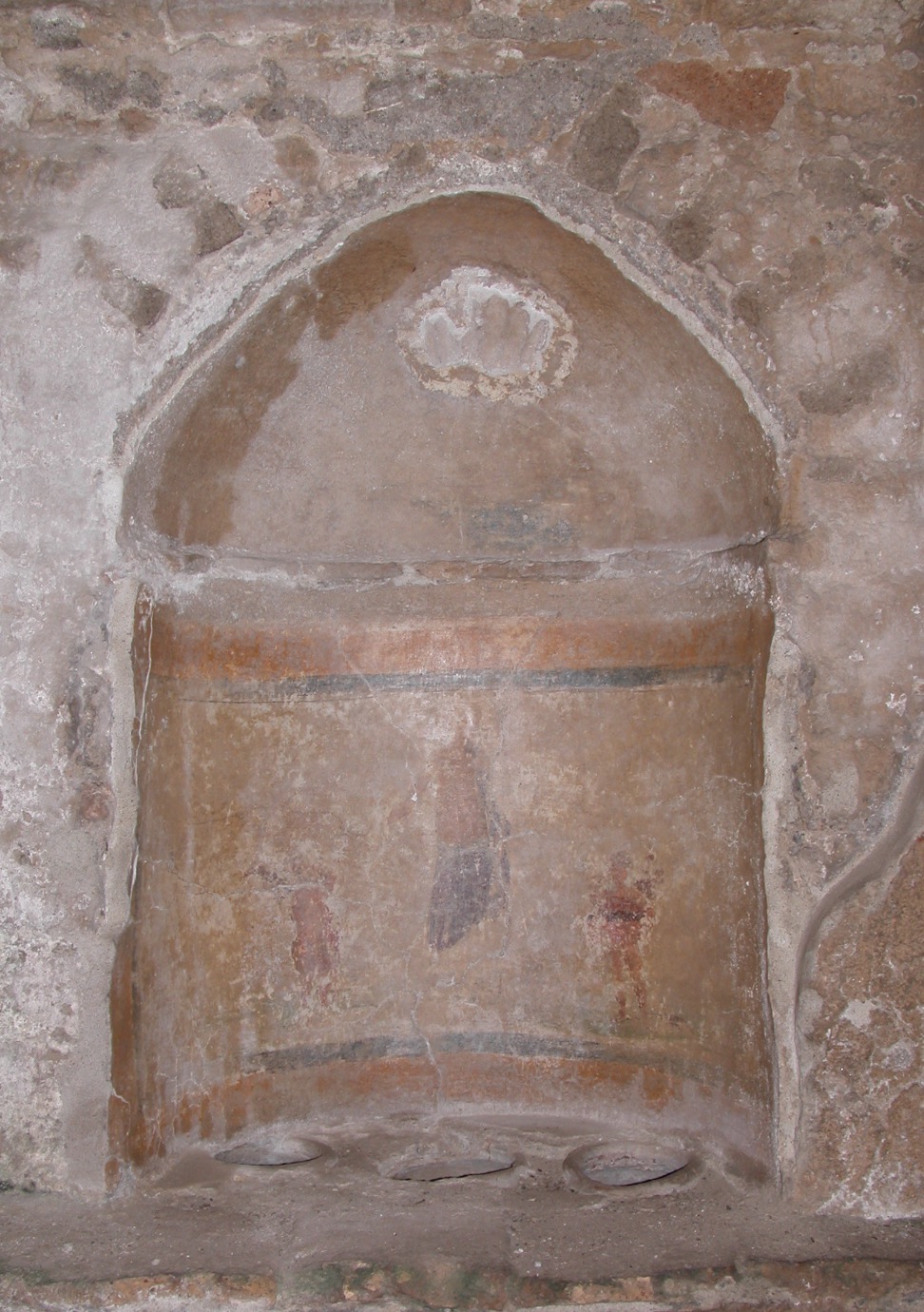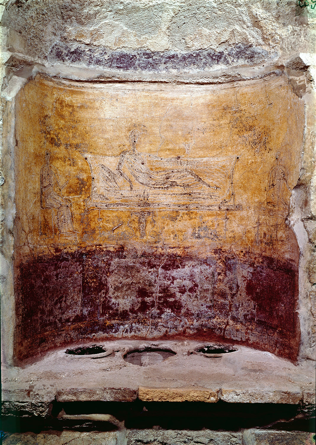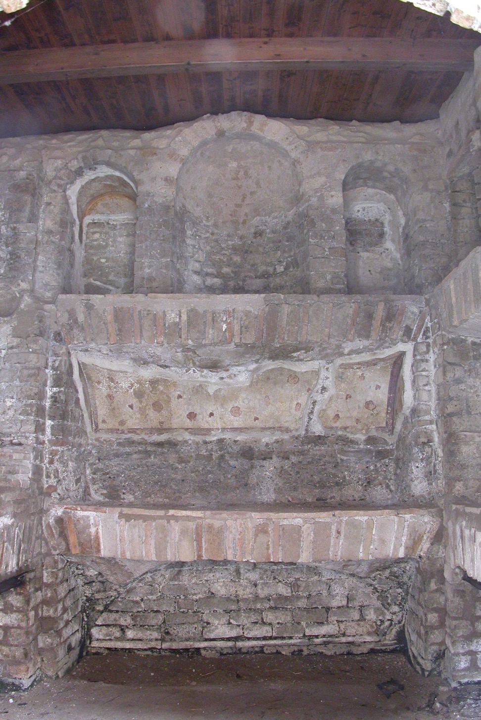 Tomb 16: cella-type tomb; at the sides of the door are two reliefs in tuff, originally in the form of dolphins. The ritual is mixed. The walls are decorated with paintings of various themes and stucco. The enclosure, also for the mixed-rite, in the area in front of the cella, where there is a pit, is paved with a mosaic with a Nilotic landscape. The inscription mentioning the road called ‘bia Flabia’ comes from here. The cella can be dated to the middle of the 2nd century A.D., the enclosure dates to shortly afterwards.