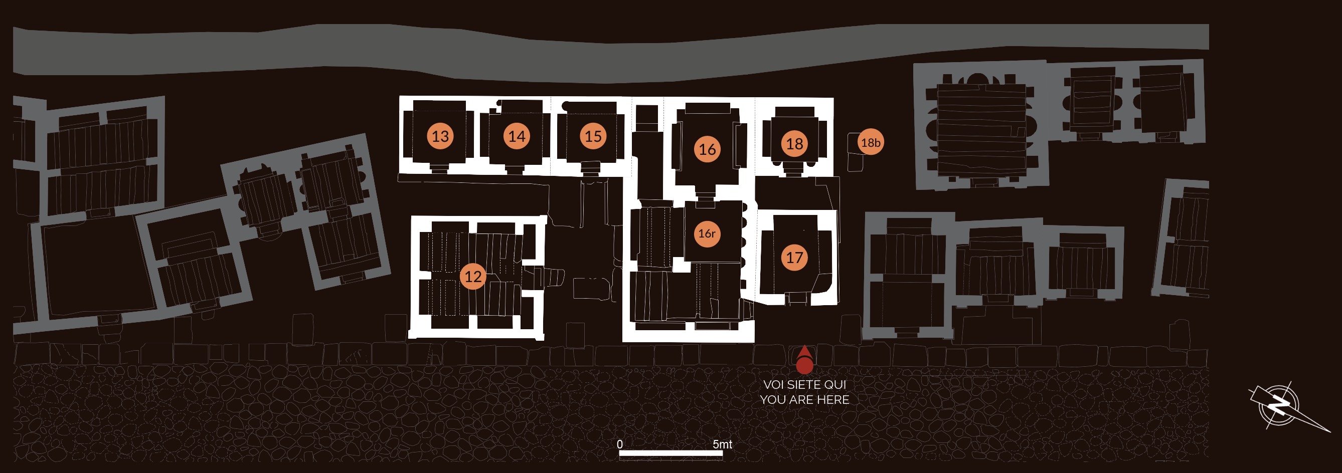 Tombs 17 and 18: cella-type tombs; the first contains interments in a double order of arcosolia in the walls and formae beneath the floor level; in the second, the rite is mixed. Dating: second half of the 2nd century AD.