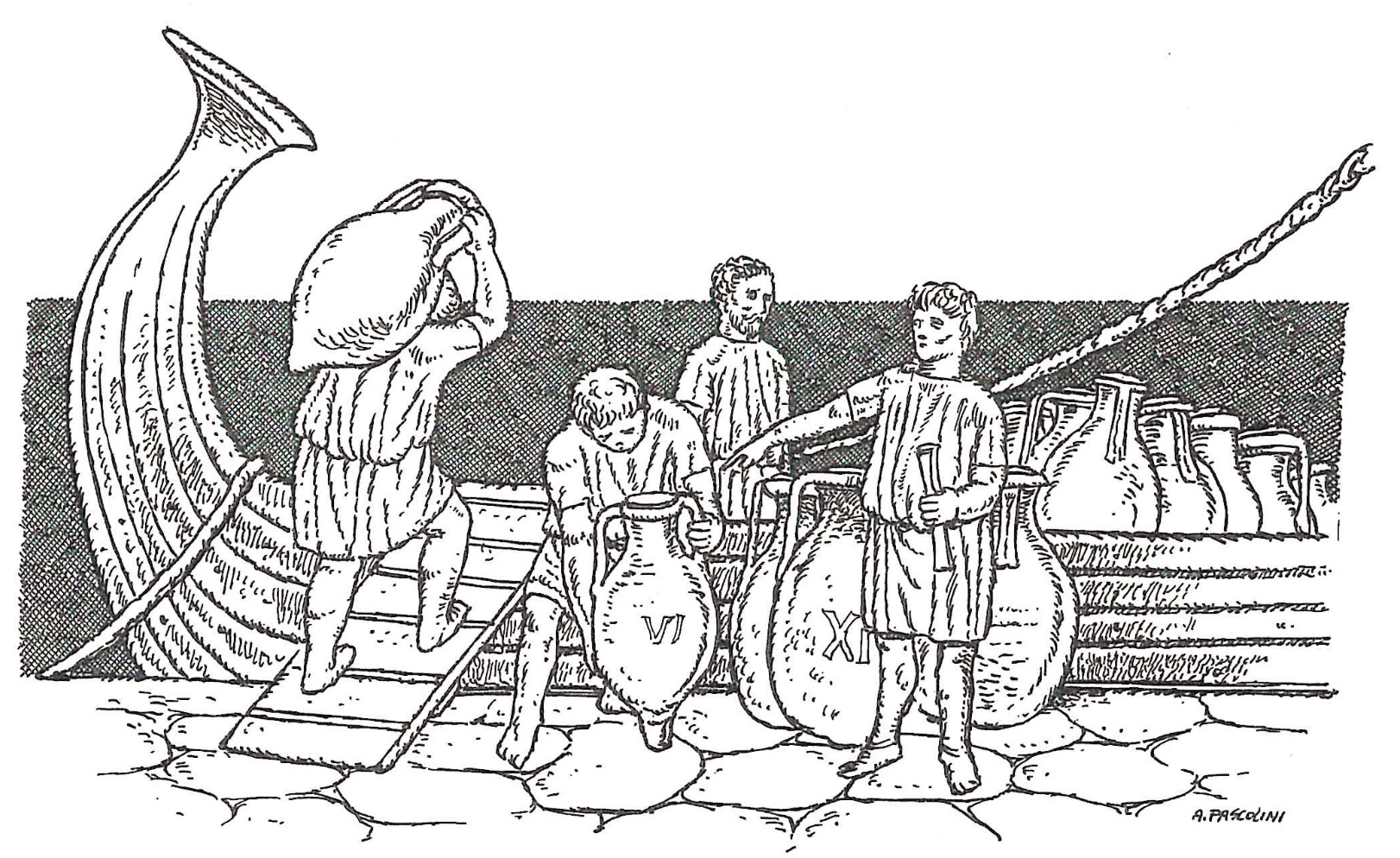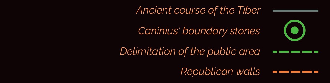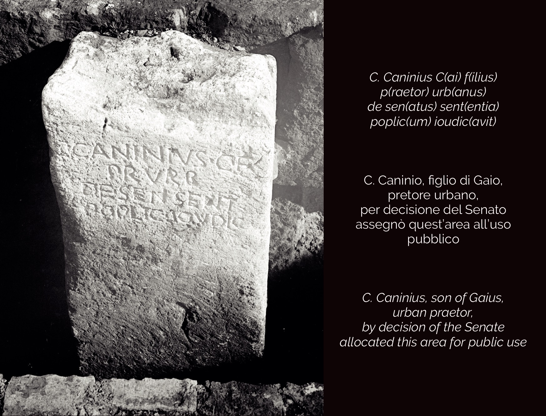 The travertine boundary stones that took their name from the praetor Gaius Caninius delimited an area of public land between the Tiber and the Decumanus in the eastern sector of the city. Set aside for the unloading, transportation and storage of goods, a prohibition against the construction of private buildings was in force in the area. The boundary stones date to the late Republican period, around 140 BC, and are evidence of the enlargement of the port of Ostia in connection with the economic and social reforms of the Gracchi. The gradual raising of the street level and the occupation of this strip of public land by the complexes of the Imperial period led to the boundary stones definitively losing their function.