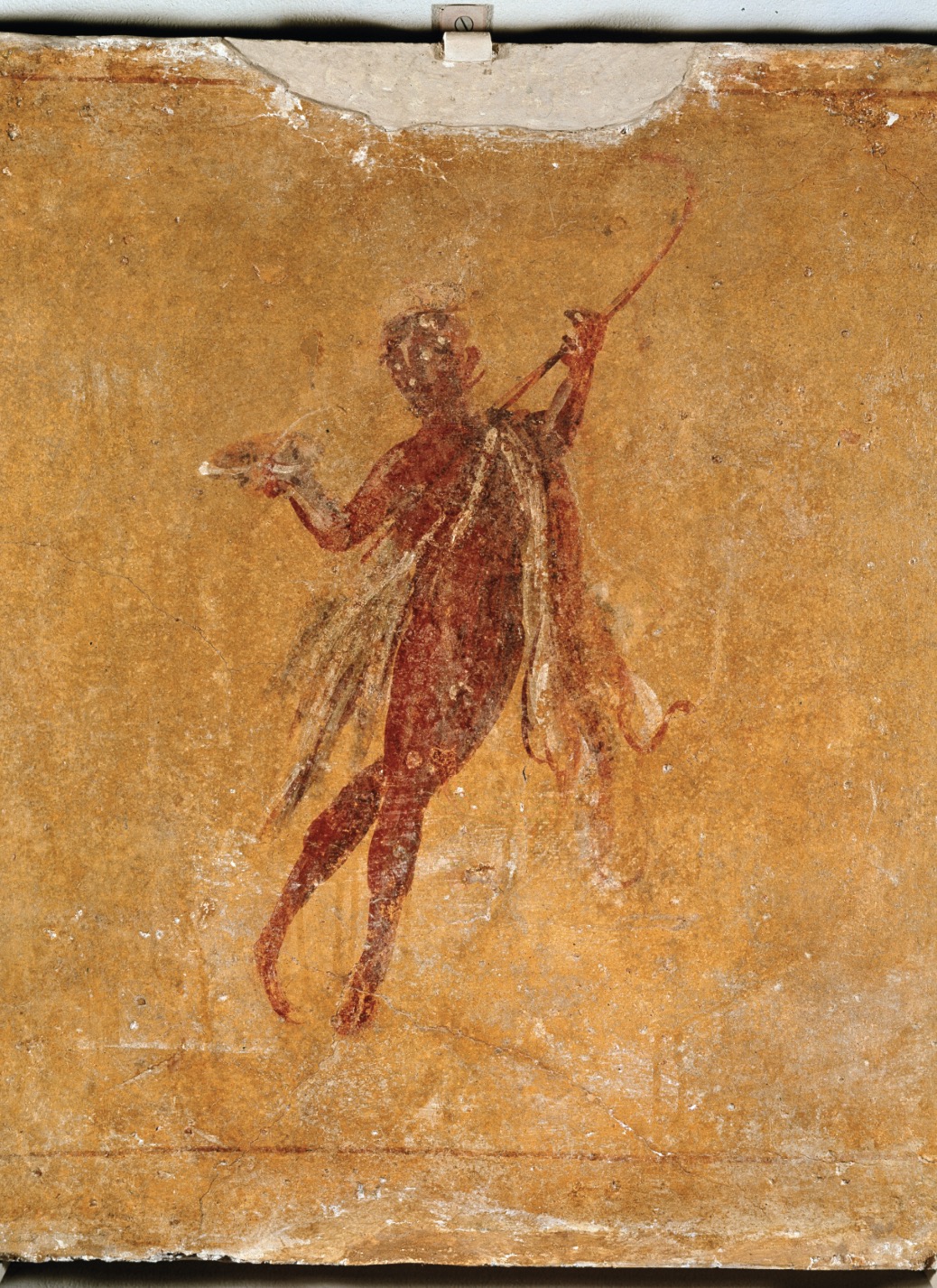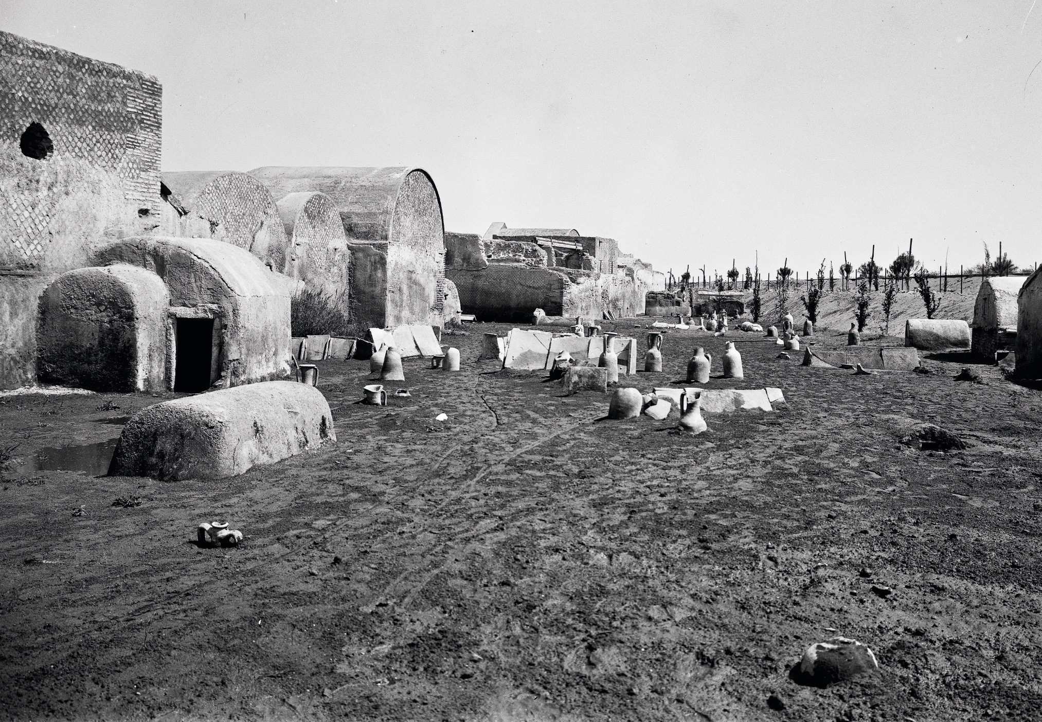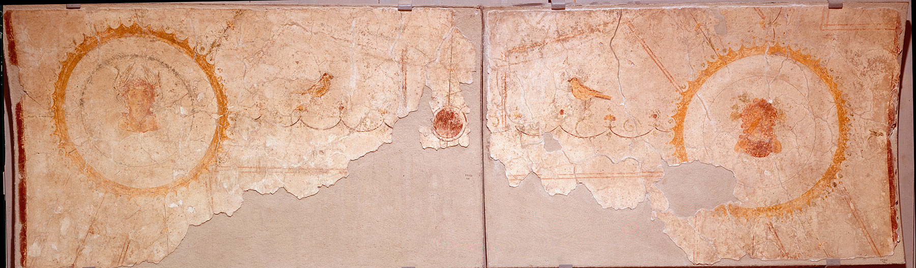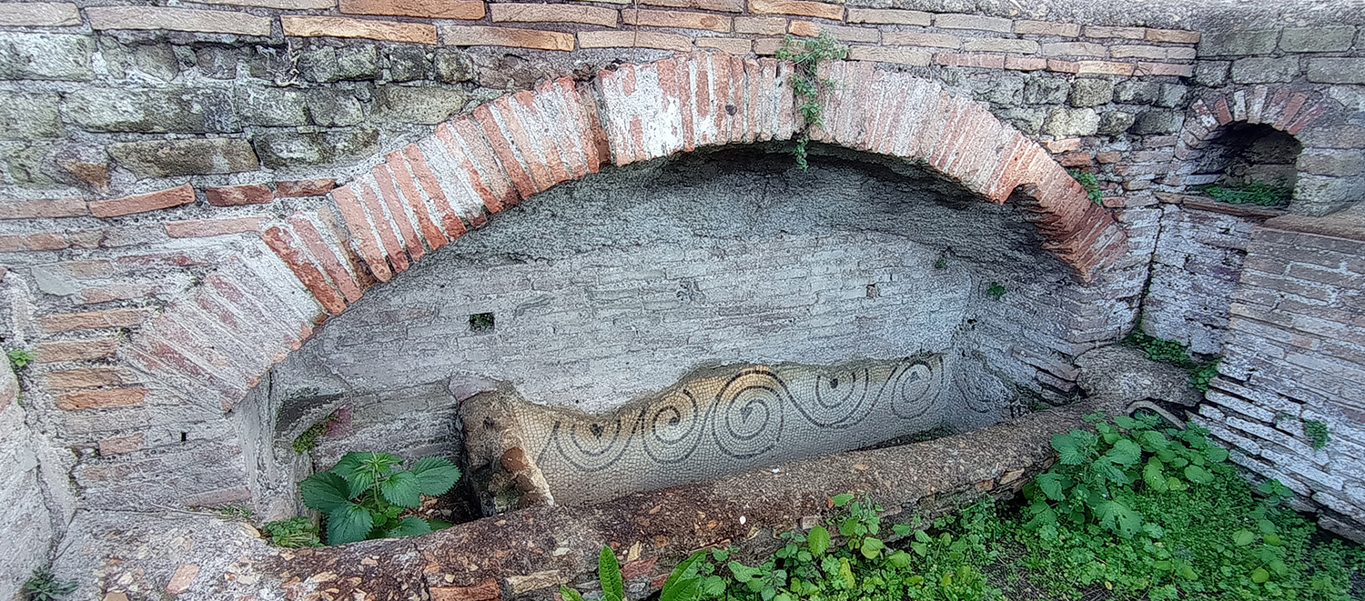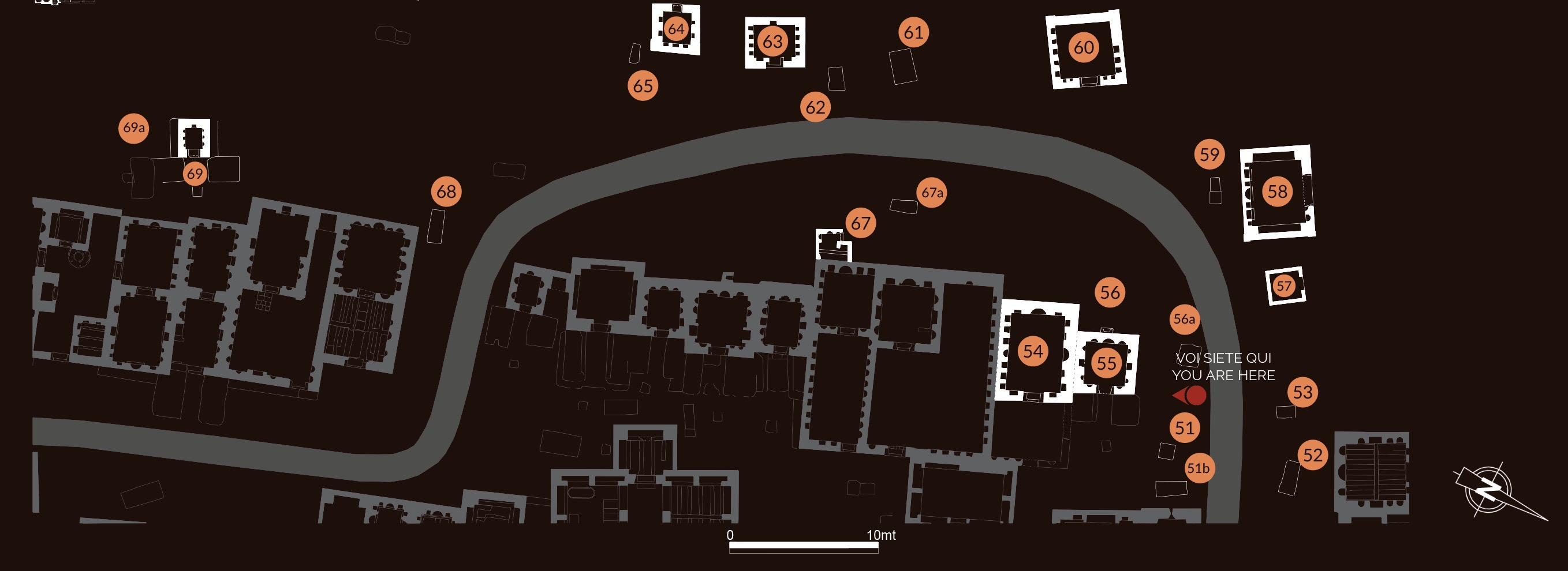 Tombs 54 and 55: cella-type tombs with preparations for banquets placed against the façades and interiors set up for the mixed ritual. In Tomb 54, dated to approximately 130 AD, the floor mosaic bears the name of the deceased (Titus Iulius Argius). Tomb 55 (138-192 AD), bore rich painted decoration, much of which detached.