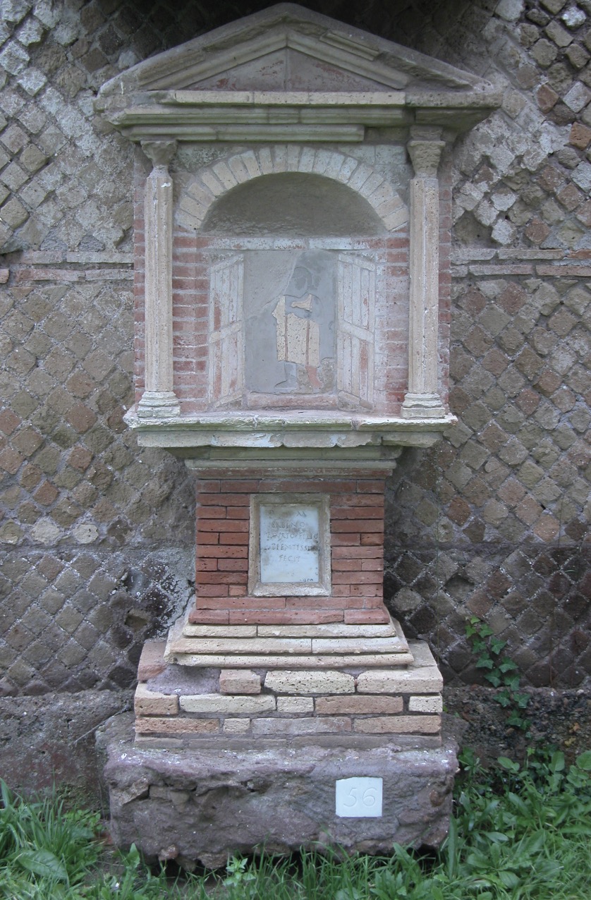 Tomb 56: an aedicule tomb, it was reassembled at the back of Tomb 55, while it was originally placed against the northern wall. Alluding to the moment of death is the figure of the deceased framed by a half-opened door. Dating: mid-2nd century AD.