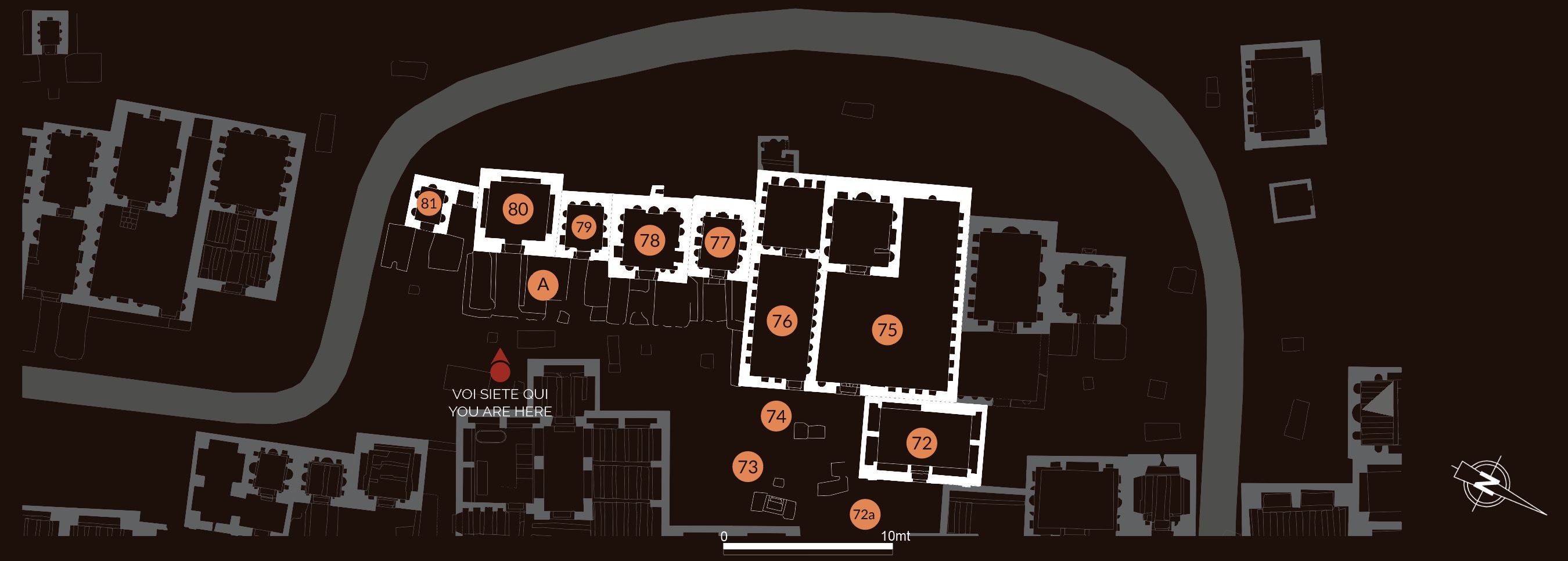 This sector’s current appearance is the result of later elements placed upon the older buildings and is characterized by the presence on the façade of masonry preparations for banquets.