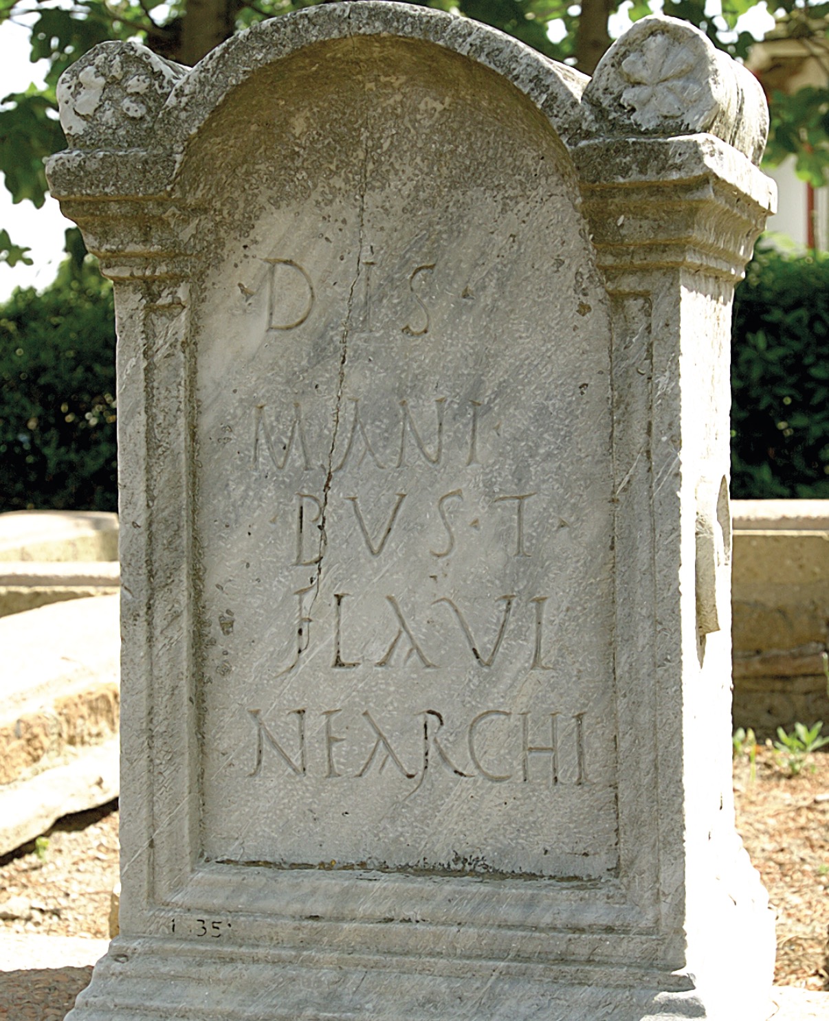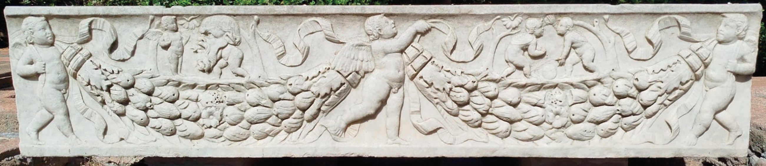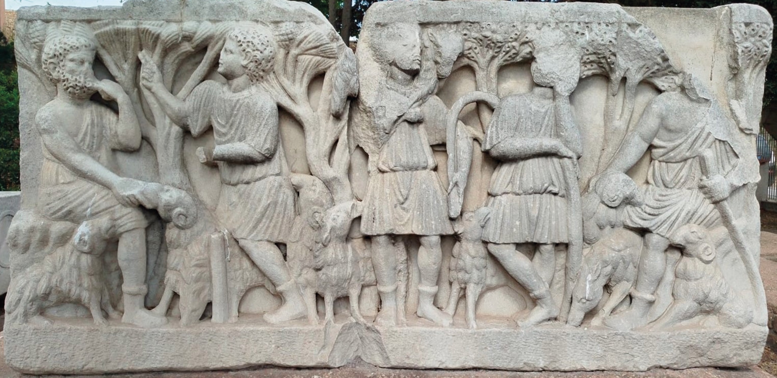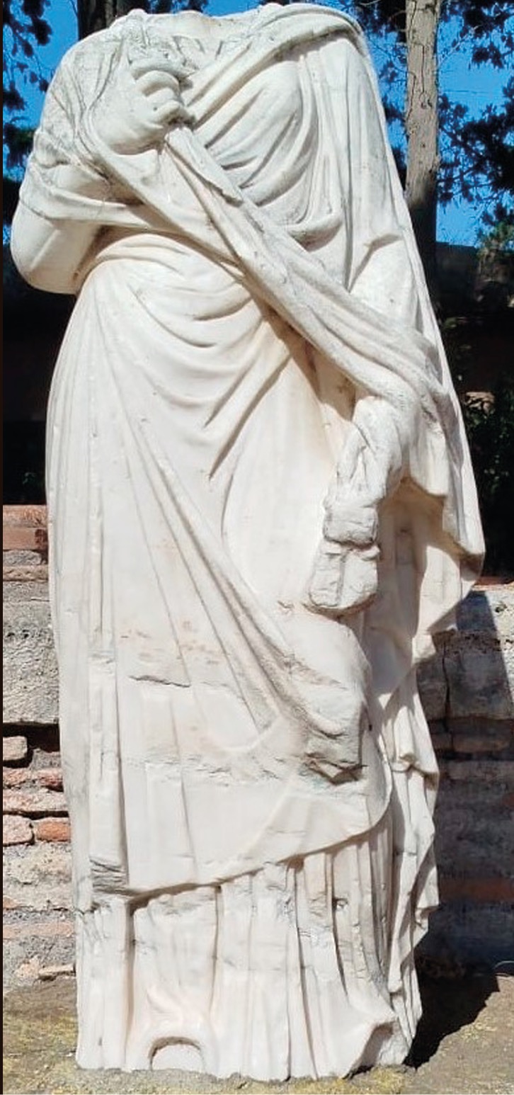 Placed along the road are some of the marble finds discovered in the Necropolis and the adjacent land during the excavations by Guido Calza between the 1920s and 1940s: the parallelepiped-shaped altars with tympanum roofs and epigraphic tabula on the front, dating to the first half of the 2nd century AD; the headless female statue, of the “Grande Ercolanense” type from the Age of Trajan (98-117 AD); various sarcophagi, prominently featuring the one that is “bisomous,” or intended for two burials, with heads of Gorgons, dating to the second half of the 2nd century AD, the one with pastoral scenes interpreted by some as Christian, from the 3rd century AD, and lastly the strigilated one with lions from the 3rd century AD.