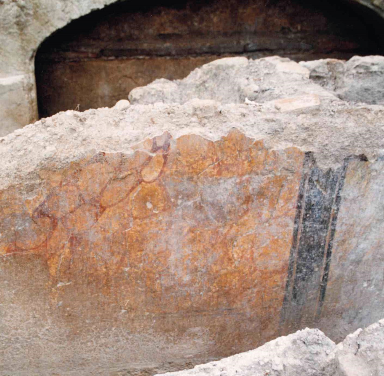 Tombs E27-E28: this complex, intended for the mixed ritual, consists of a cella and a roofed enclosure on the southern side, with a terrace held up by three pillars. Access to the terrace was provided by a stairway placed at the centre of the enclosure’s eastern wall; a pit is situated near the cella’s entrance. A painted decoration depicting two male figures to the sides of a table is conserved on the interior wall of the eastern arcosolium in cella E28.