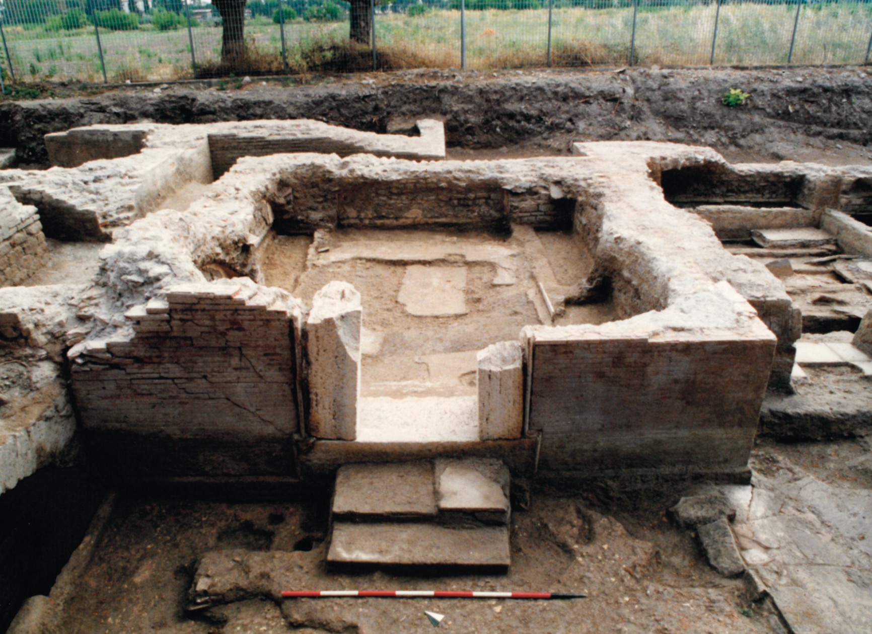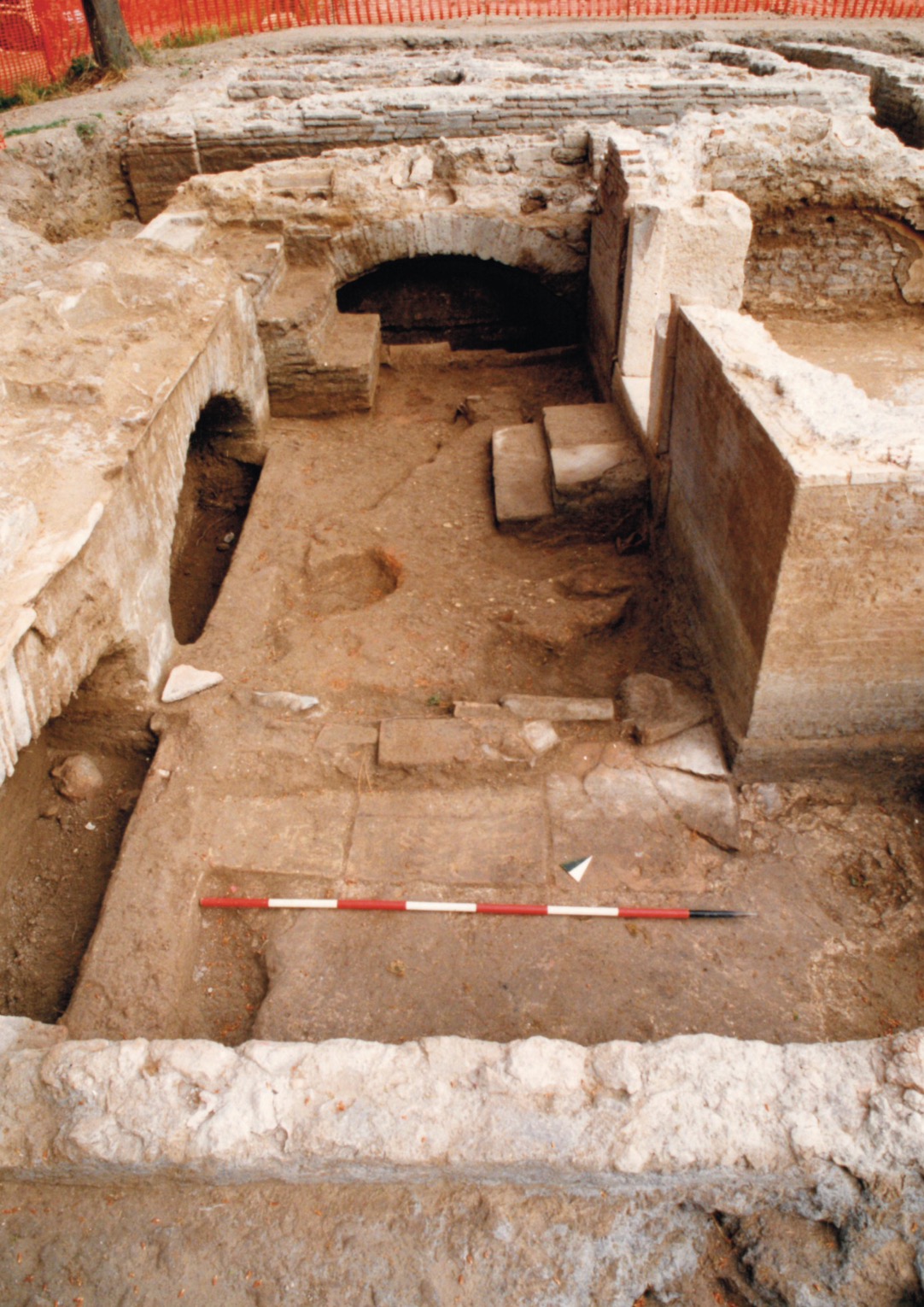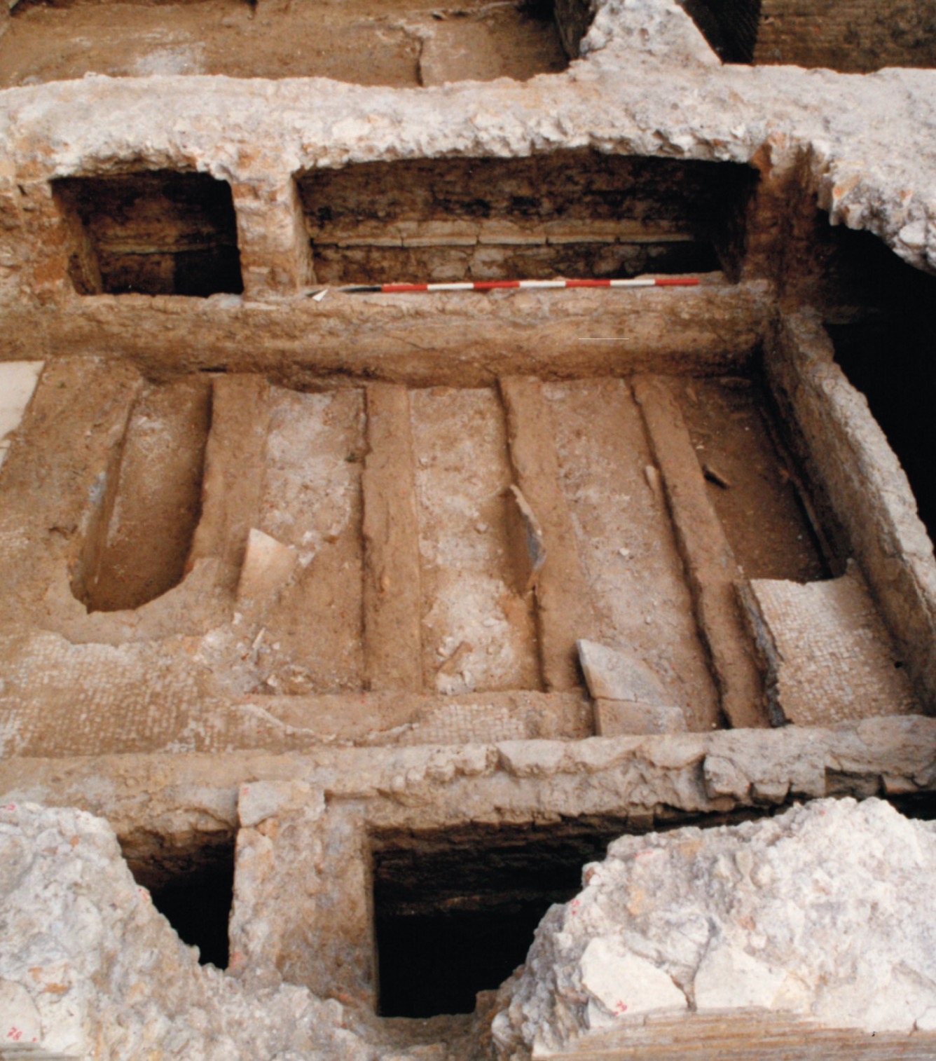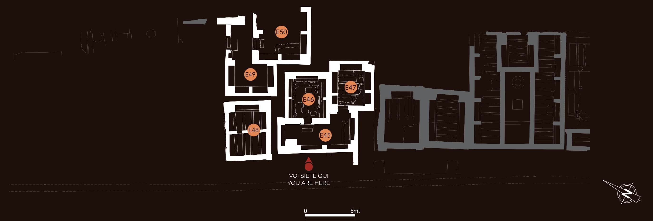 Tombs E45, E46, and E47: this complex’s layout is quite articulated, with an enclosure in front of two cellae intended for the mixed ritual with arcosolia and niches and formae. In the E45 enclosure, the alternation of rectangular and semicircular painted niches, emphasized by stucco half-pilastres, may be seen. Cella E46 conserves the remains of the floor mosaic with a floral motif. Built later, the E47 cella was in mosaic with a white background and black bands indicating the perimeter of the burials beneath (formae), thus facilitating their identification for subsequent burials.